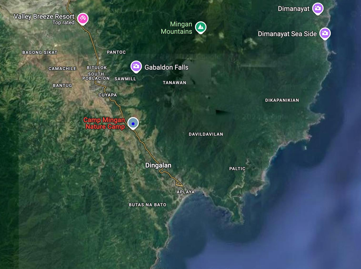 マップ:Camp Minganは山に囲まれた地形です。