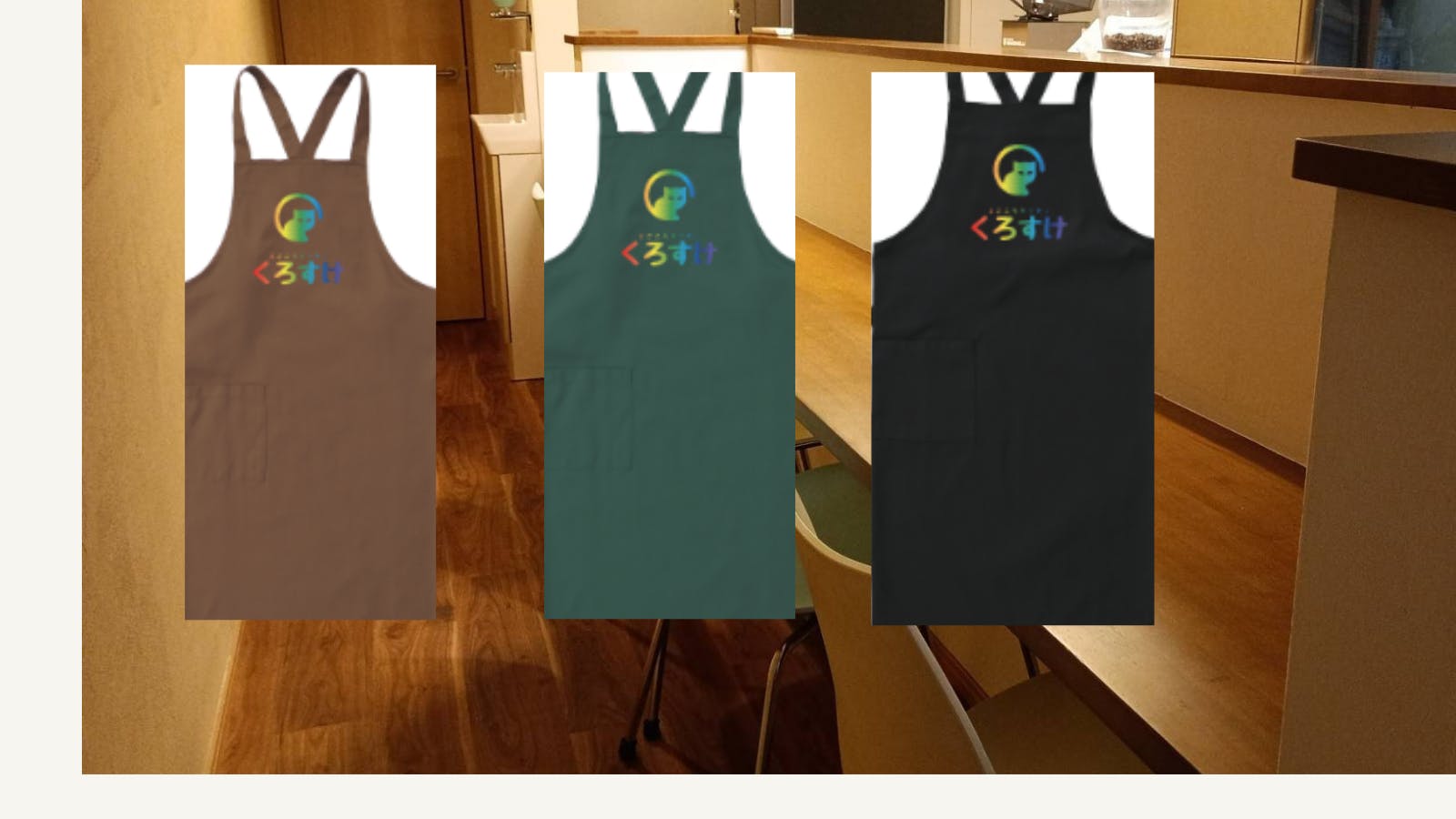 ついさっき、エプロン決まりました。イメージですが、真ん中の緑色と、茶色に来ましました。ロゴマークは虹色です。