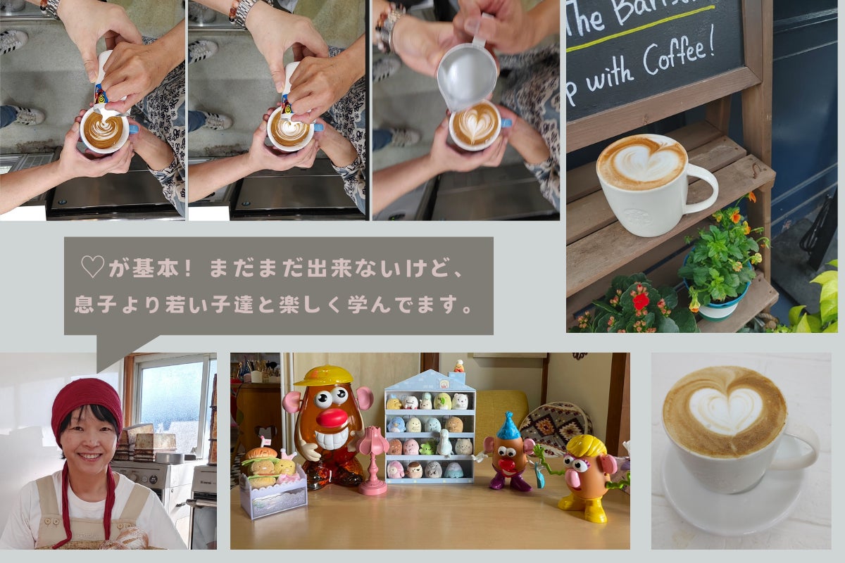 それからしばらくしてのこと。スタバなんて半年に1回も行かない私が、たまたまつくばイオンの買い物帰りにスターバックスラテを注文したら、コーヒーの表面にハートのラテアートが描いてあったんです。ラテアートが書いてあるなんて、カップのフタを開けなかったら分からなかったので、びっくり玉手箱のような感覚で嬉しくなりました。この体験から、「私もラテアートを描いてみたい!」と思い、50歳を過ぎてから埼玉県の川口まで月1回ラテアートを学びに行っています〜。