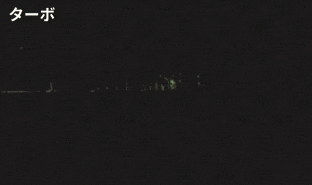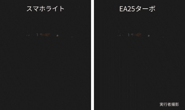※上記画像・車のハイビーム(約700~1600ルーメン)・EA25ターボモード(3000ルーメン)
