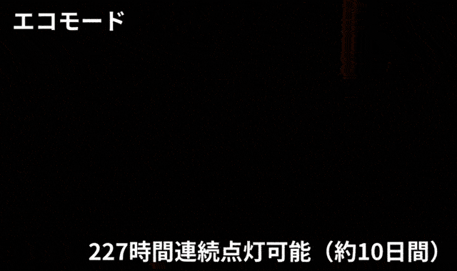 1回の充電でエコモードで227時間(約10日間)の連続点灯可能