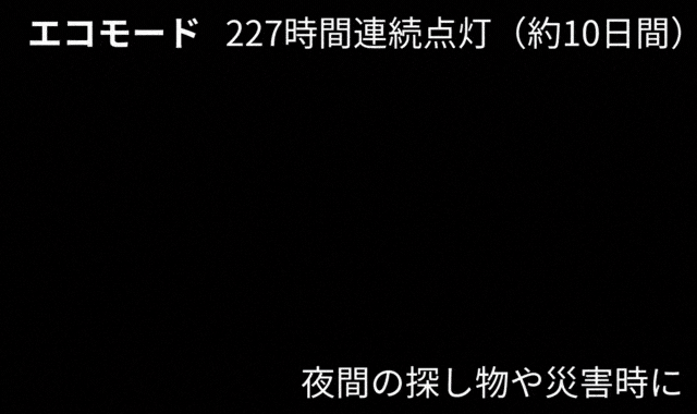 エコモード時は一回の充電で約227時間連続点灯可能、日に換算すると約10日。10ルーメンの十分すぎる明るさで倉庫の探し物や災害時の非常灯、日常使いなどに大変便利です。