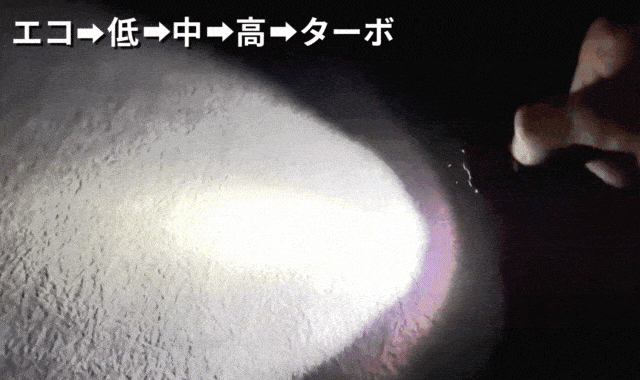 使用時間:ターボ:2.6時間・高モード:5.25時間 ・中モード:14.2時間 ・低モード:29時間・エコモード:227時間