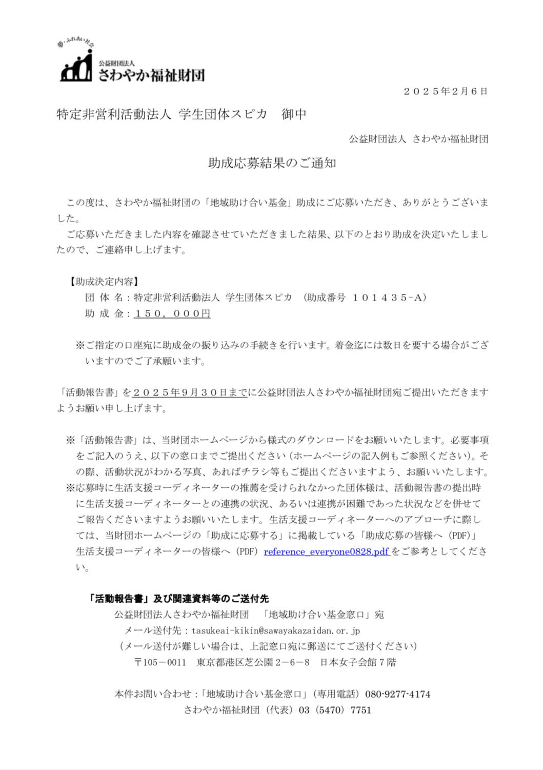 公益財団法人 さわやか福祉財団さまの「地域助け合い基金」より、助成金をいただけることになりました!