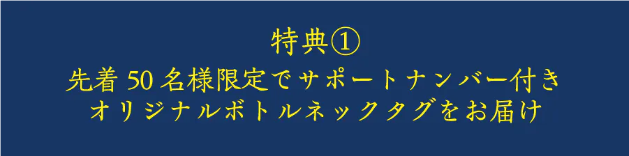 先着50名様限定で、「カイ・クボタ」だけの特別なボトルネックタグをお届けします。タグには、ご支援者様専用のプレミアムサポートナンバーが刻印されており、世界でただ一つ、あなただけのオリジナルアイテムです。この貴重なタグが手に入るのは今だけ。特別なワインを手にする喜びとともに、あなたの手元に届く一生ものの証です。