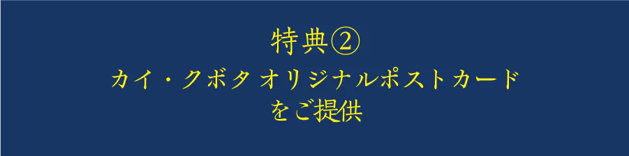 「カイ・クボタ」オリジナルのグラフィックポストカードをご提供いたします!全3種類のデザインから、どれが届くかはお楽しみです。お部屋に飾るだけでおしゃれなアクセントに。さらに、大切な人への感謝の言葉や愛のメッセージを書き添えて贈れば、きっと相手もキュンとしてハッピーな気持ちになるはず。使うたびに「カイ・クボタ」の特別感を感じられる、この限定ポストカードをぜひお手に取ってみてください。