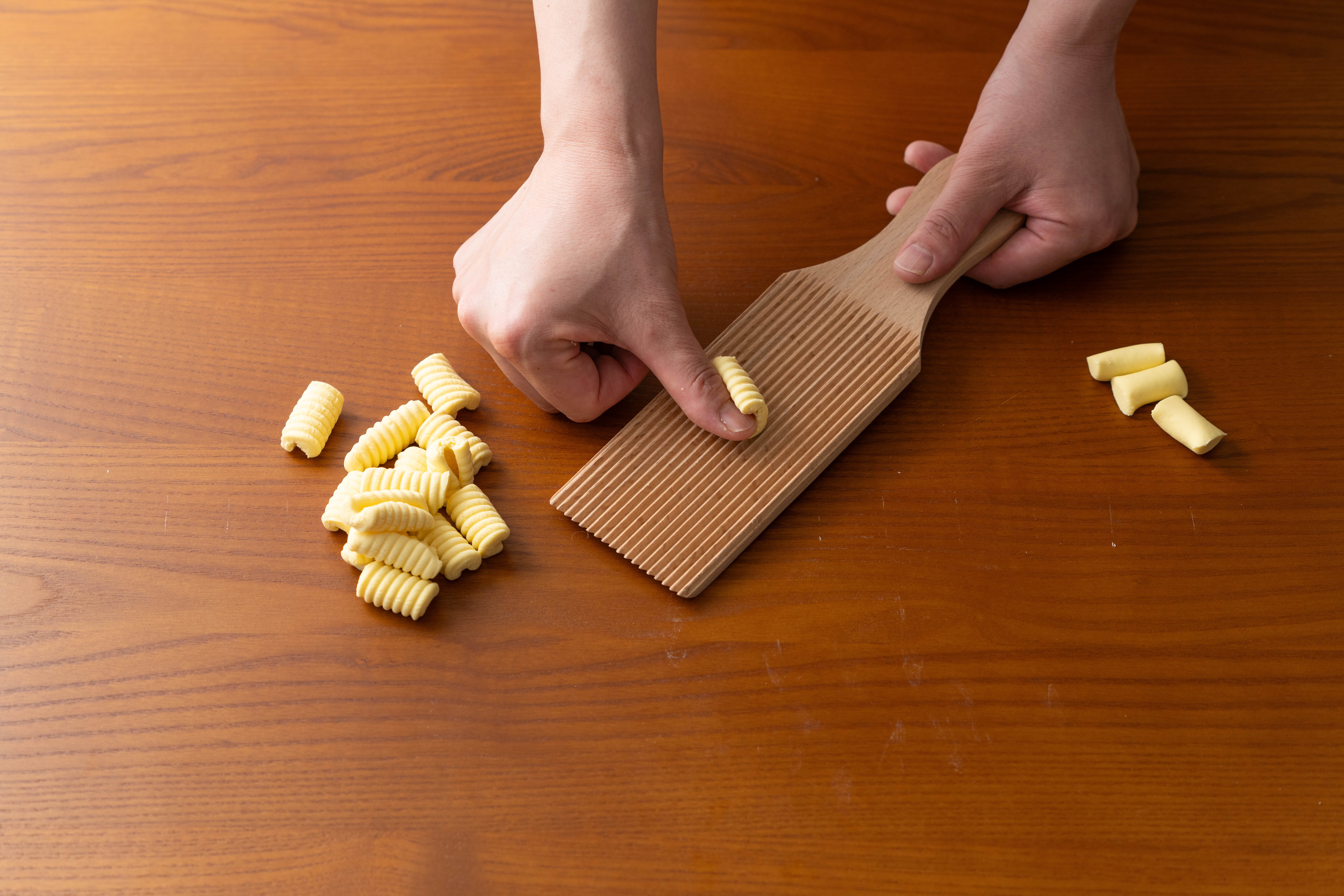 米粉パスタミックス粉 2袋、野菜パウダー2種類、スケッパー、ニョッキボード、作り方のレシピ