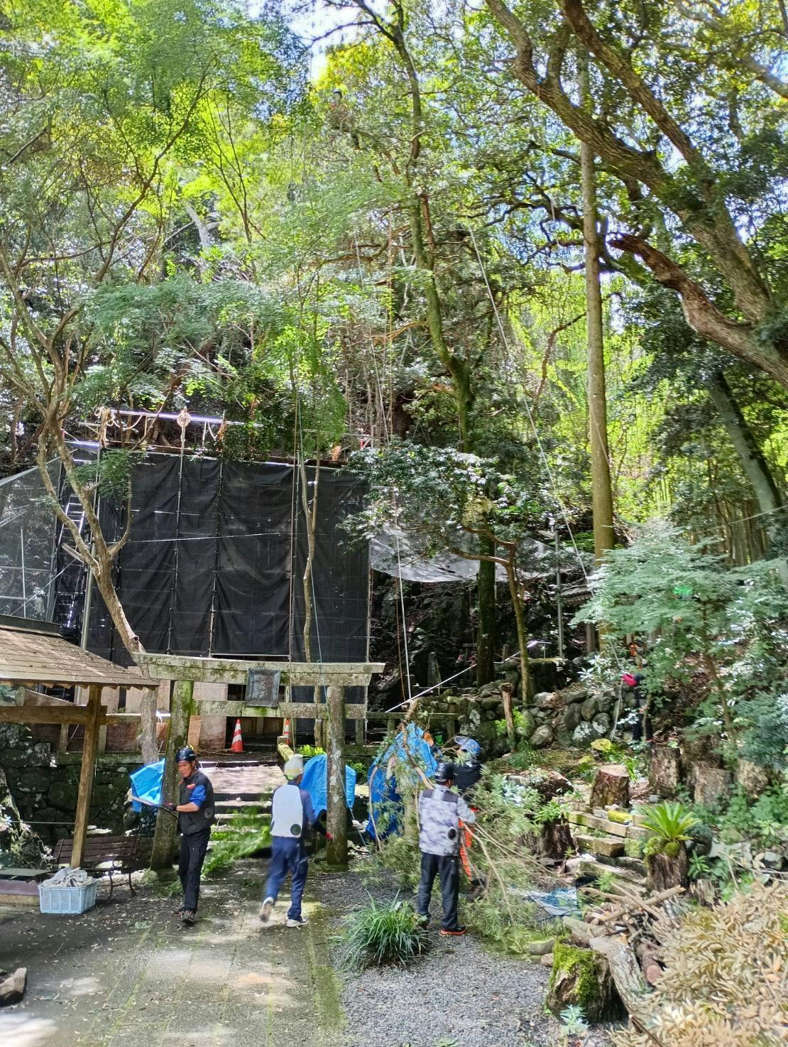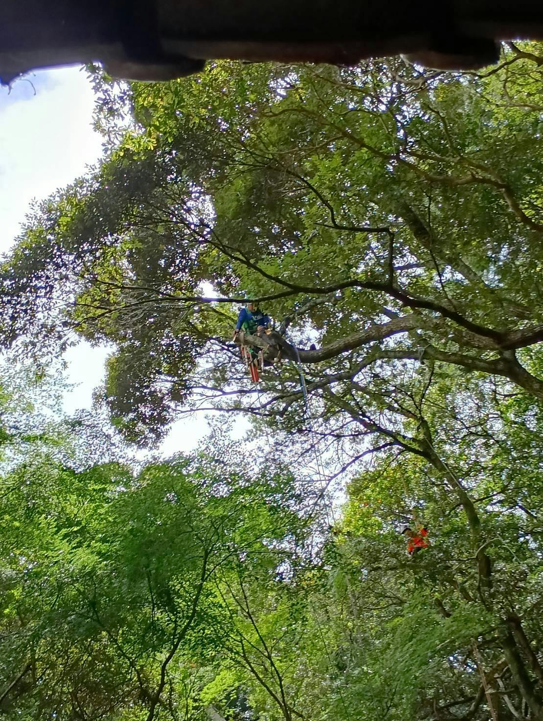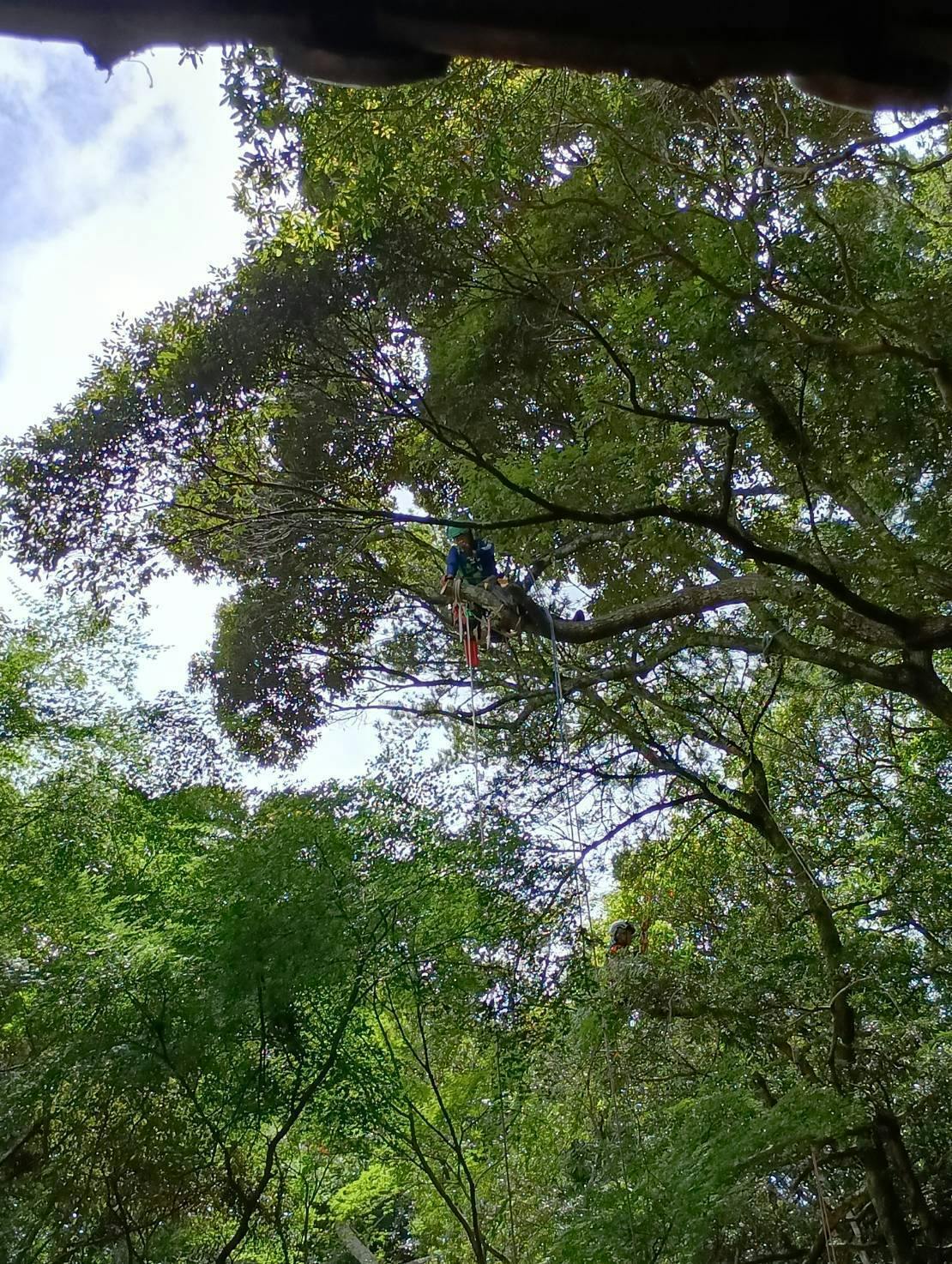 クライミング伐採3日目。今日は、本堂さんの前方向に掛かる木の伐採でした。