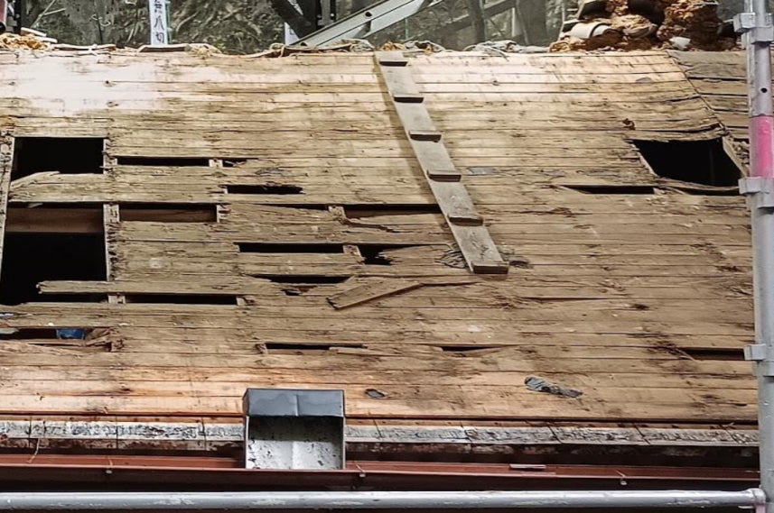 屋根は、相当厳しい状態でした。瓦をはがし、赤土をどけると、あらわれた野地板は広範囲にわたり朽ちかけていました本堂の右側面(霊府堂から見た所)「いつ天井が落ちてきてもおかしくないくらい野地板が傷んでいた」と業者の方から言われました。野地板の上に敷かれた杉皮とそれを押さえる胴縁は、腐って無くなっており、野地板の所まで水が入っていた状態。瓦もかなり傷んでおり、再利用し葺き直しできる状態ではなかったとも言われました。