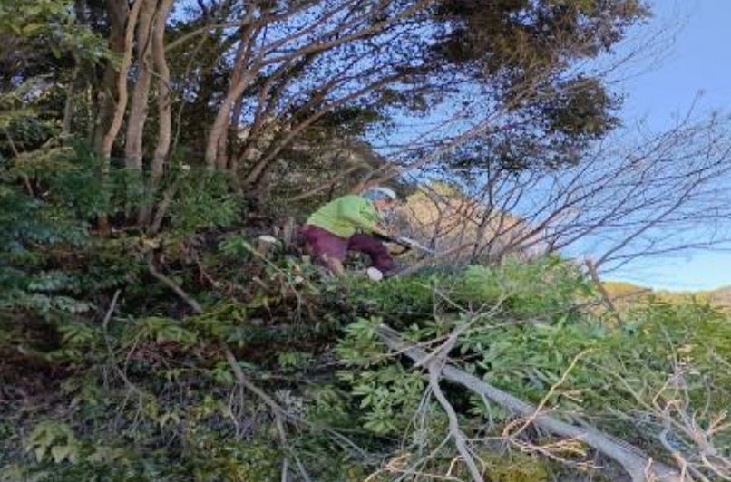 2日間にわたり、稲荷堂下の木の伐採をし、運び出しました。 伐採した木の運び出しと撤去作業霊府堂の屋根も、ずいぶん前から傷みズレていました。修繕に充てるお金が厳しいため、応急措 置として瓦を固定する作業をしました。 四方の鬼瓦一つ一つをロープで固定しつなげ、そこに ズレ落ちかけた瓦をくくり付けるという根気のいる作業でした。大師堂の左奥の崖から度々岩石が崩れ落ち、大変危険な状態でした。落下防止用のネットを張り、 しっかり固定してもらったので安心してお参りしていただけます。