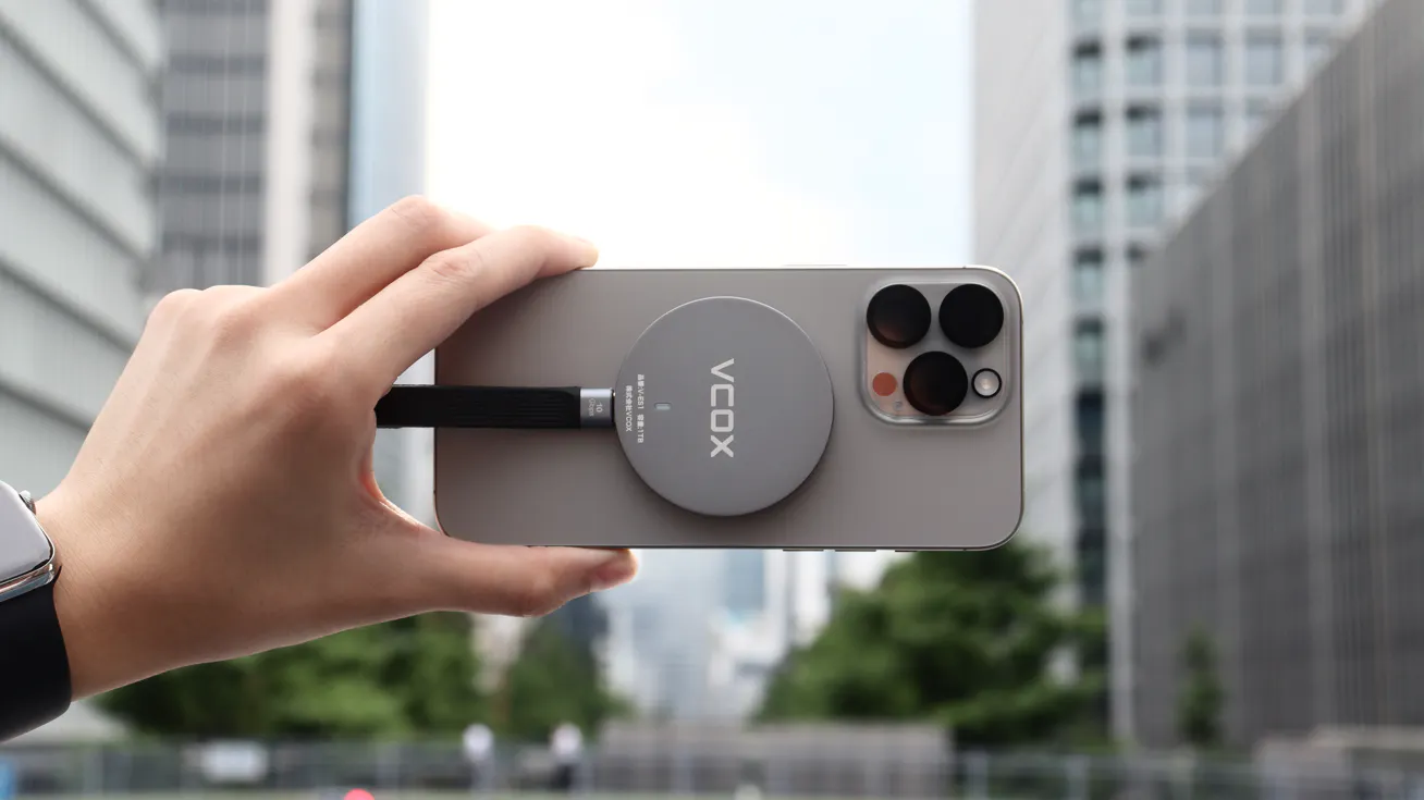 『VCOXマグネット式SSD』は、マグネット部にピタッと取り付ければ、iPhoneと一体化し、Apple ProResビデオを撮りながら直接保存できるSSDです。