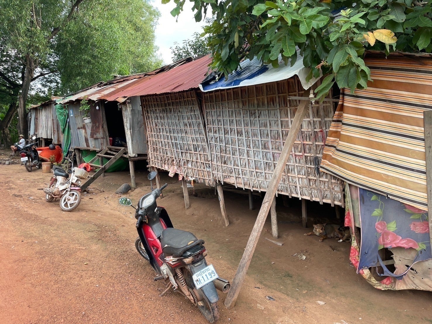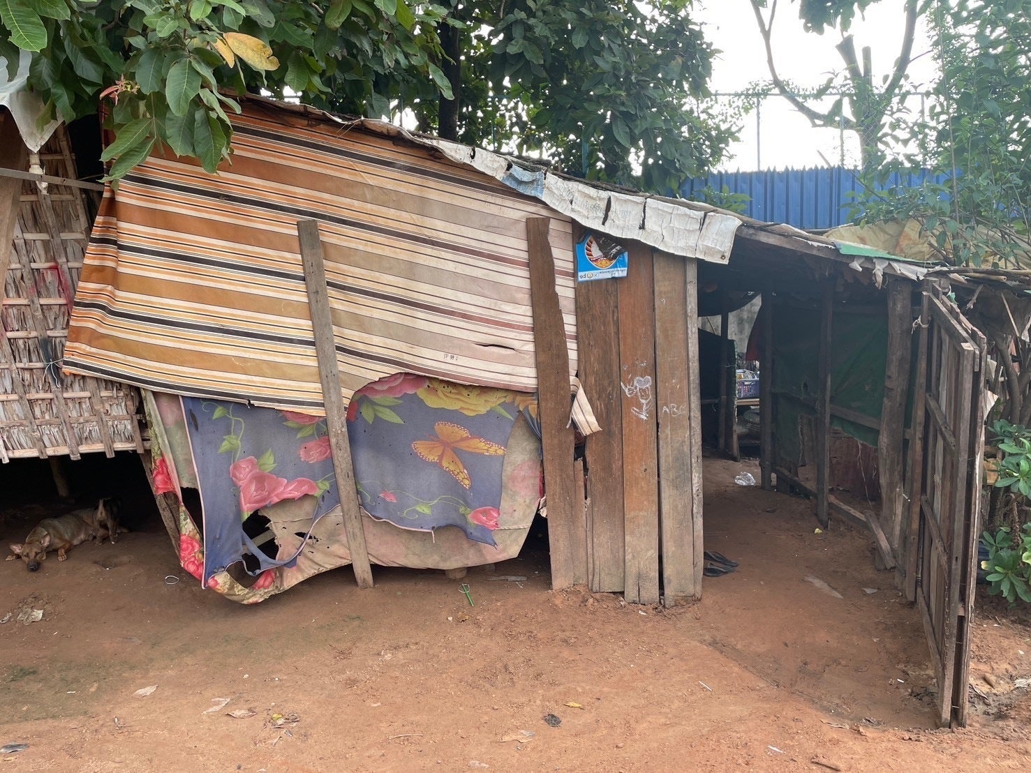 一番端の家で床は地面がそのままの土間の状態です。カンボジアの雨季は道路が冠水するほどの雨が降るので、もちろん家の中にも雨が入ってきてしまいます。壁はところどころなくなっており、布がひかれています。