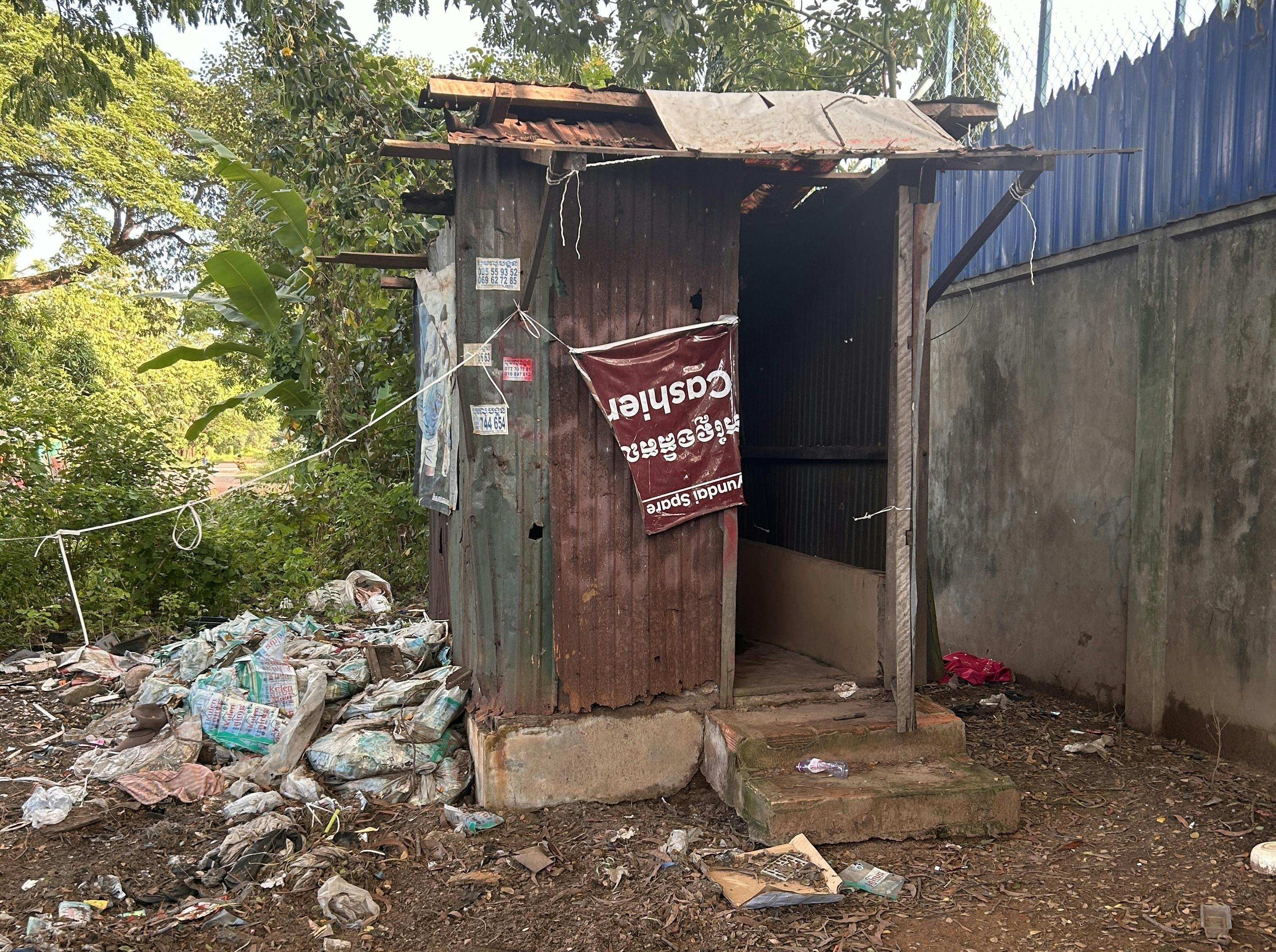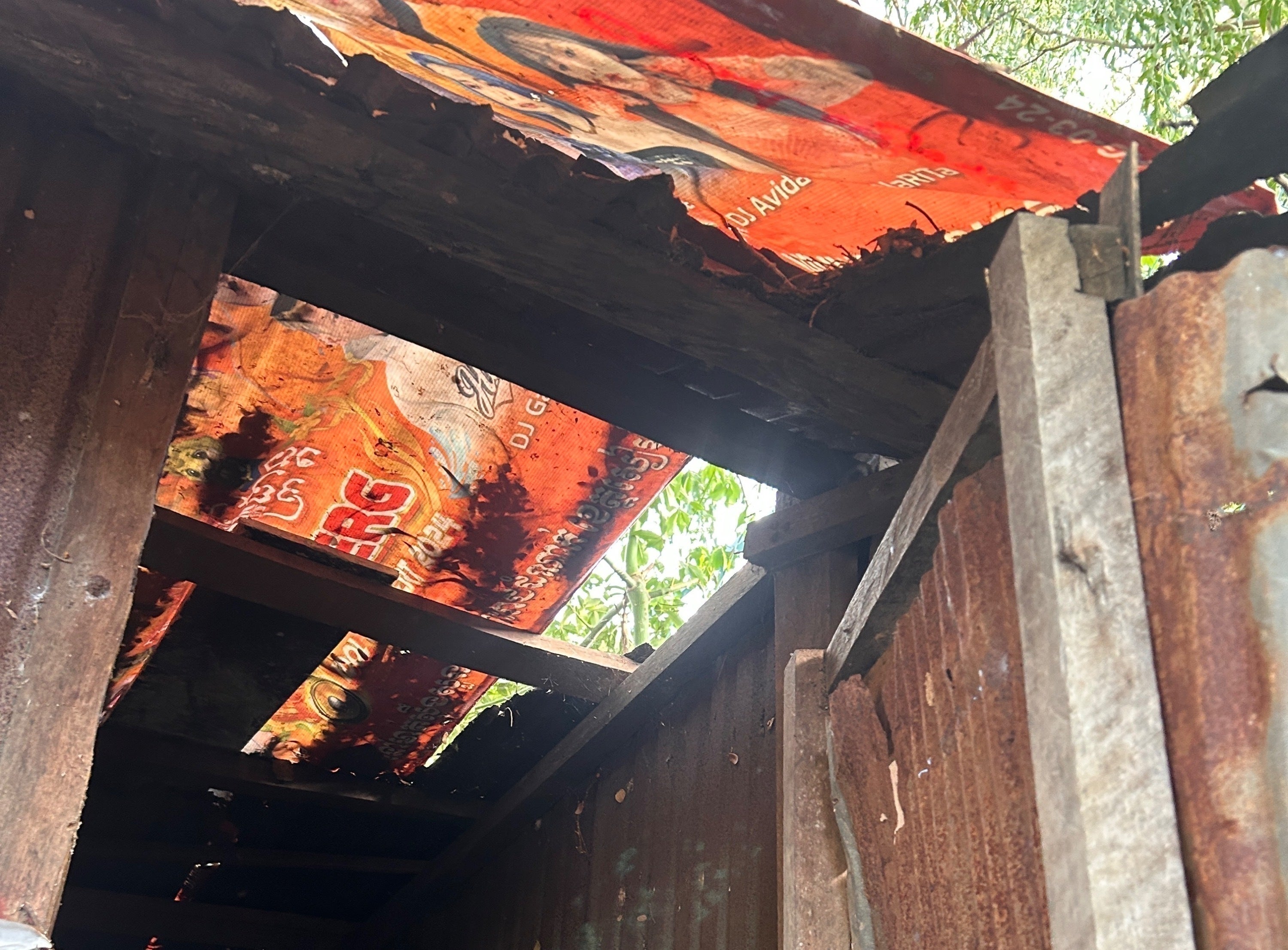 家族から生活状況の聞き取りをすると、一番困っていることは使えるトイレがないということでした。並びの4世帯で共用のトイレがありましたが、壁やドアは壊れ、穴だらけでとてもじゃありませんが使える状態ではありません。