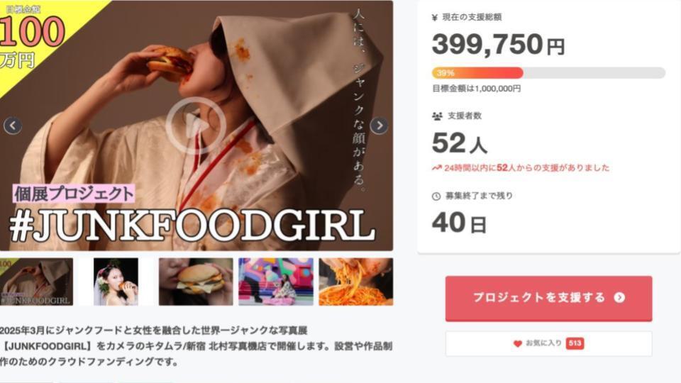 JUNKFOODGIRL個展プロジェクトは無事、開始4日で目標金額100万円を達成することができました。ご支援いただいた皆様、ありがとうございます!様々な形で応援を、思いを伝えてくださる方々に本当にこの4日間は胸が熱くなりっぱなしでした。...え?4日間・・??そうです。目標は達成しましたが、クラファン始まってからまだ4日しか経っていません。あと39日もあるんです。今回のクラファンの目的は「1人でも多く個展のことを知ってもらい、来てもらうこと」なので、支援者数を「200名」とネクストゴールを置いてさらに再出発を切ろうと思います。上振れた金額については下記に使用します。①個展展示品の品目増加(15点⇨25点)②展示印刷のサイズアップ、展示素材のグレードアップ③個展開催までの広告費およびマーケティング費用集まった金額は全額個展のために使います。最高の個展を皆様に見てもらいたいその一心で頑張ります。ぜひ、引き続きどうぞよろしくお願いいたします。ムラカミリョウ