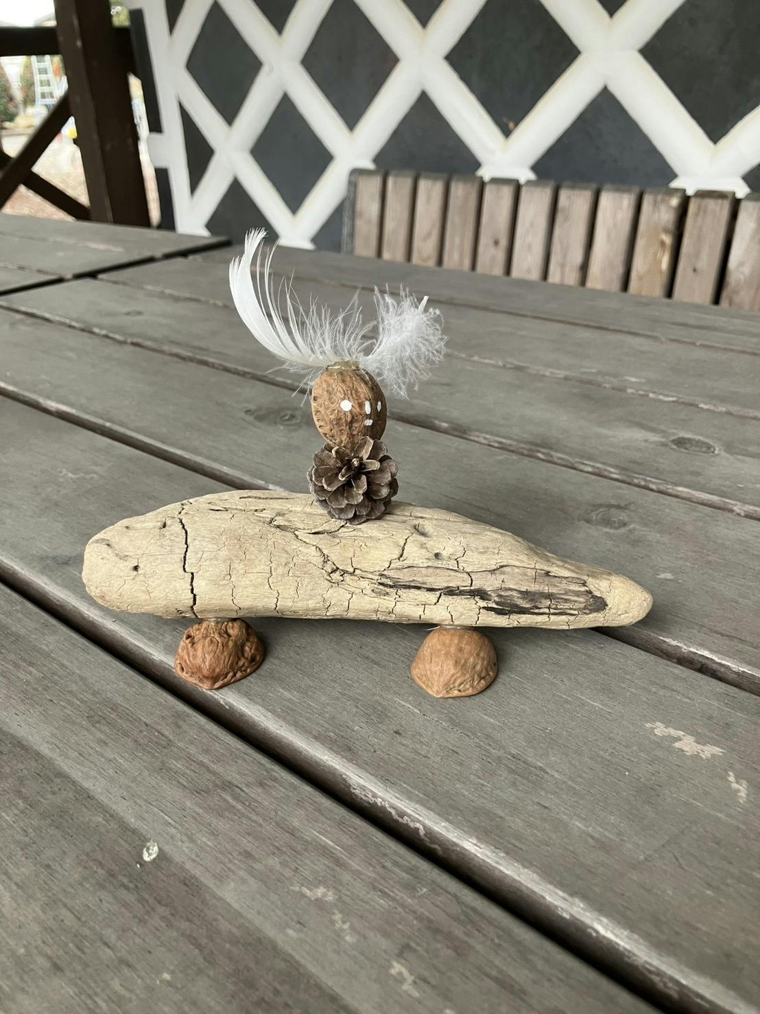 (鳥の羽、クルミの殻、流木、松ぼっくり)