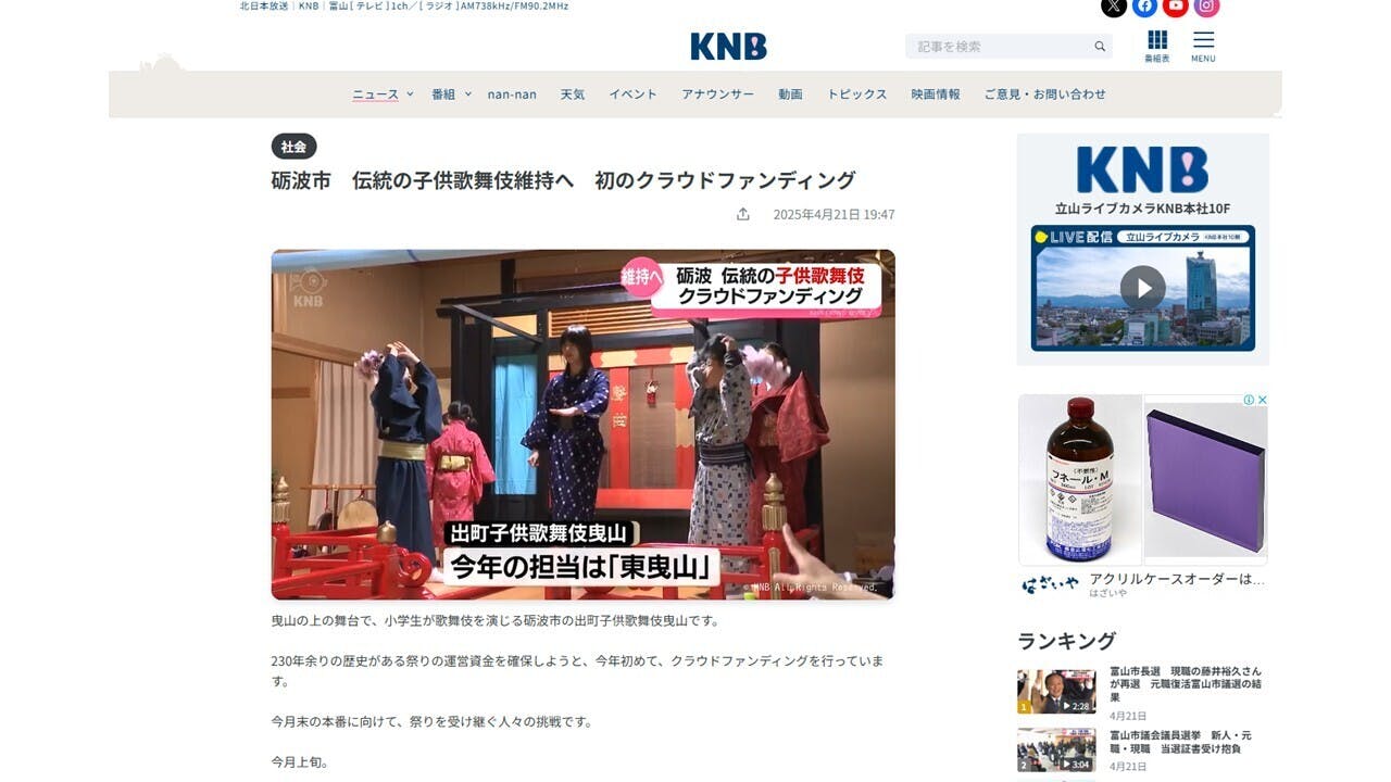 2025/04/23 09:544月21日、地元テレビ局KNBさんより、弊会のクラウドファンディング事業を紹介する放送がありました。全国の皆様からの支援により伝統ある子供歌舞伎を守っていただいた旨を、富山県の皆様にご紹介することができました。改めて、KNBさんに感謝です♪https://news.ntv.co.jp/n/knb/category/society/kn3d105283d2af4ddb8eff1a2d21174e2e↑動画はこちらから ※KNBさんのページです。ページ内の画像をクリックすると再生いたします。 もっと見る
