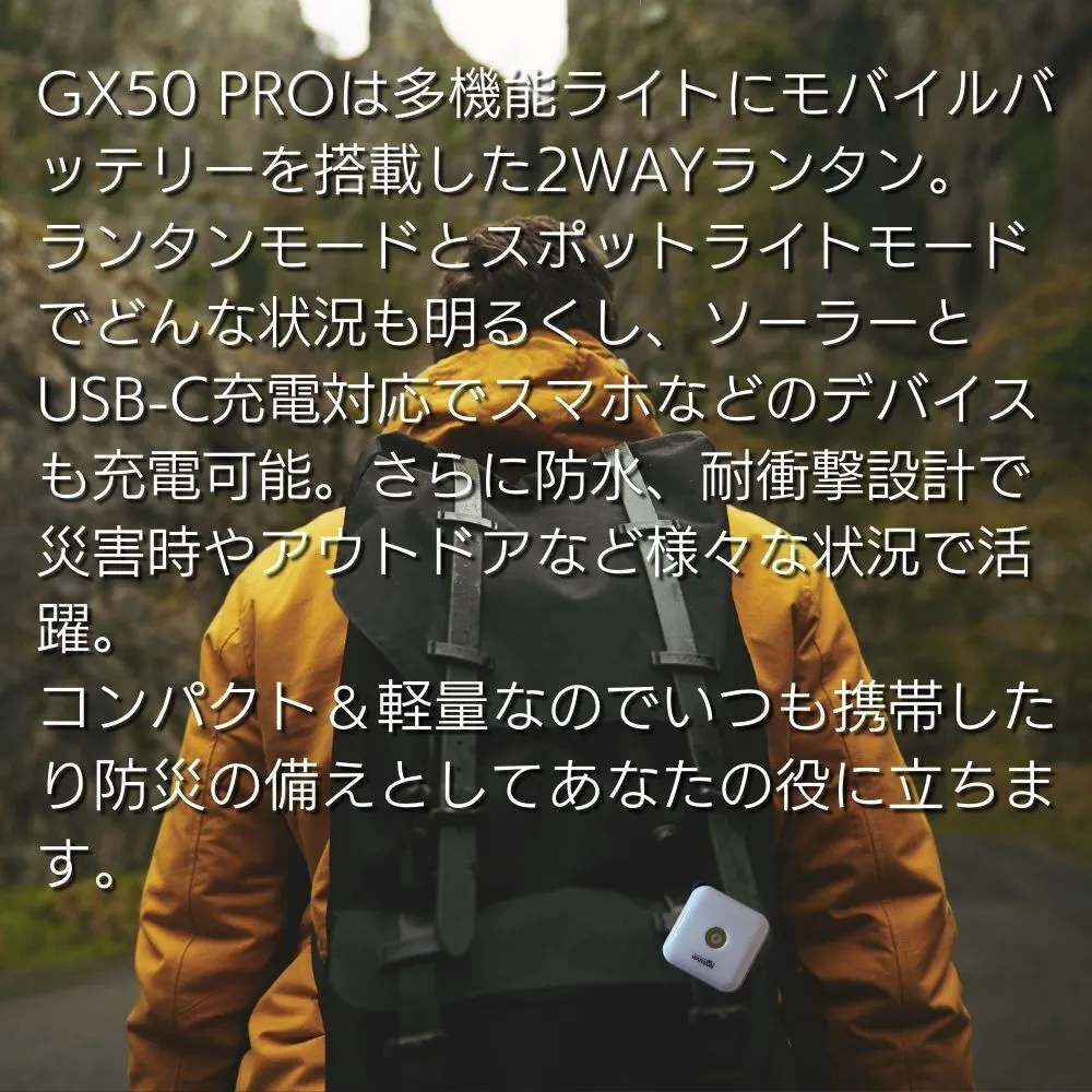 「GX50 PRO」はランタンとモバイルバッテリーを一つにした防災ランタンです。またコンパクトで軽量なのでどこにでも携帯出来ます。
