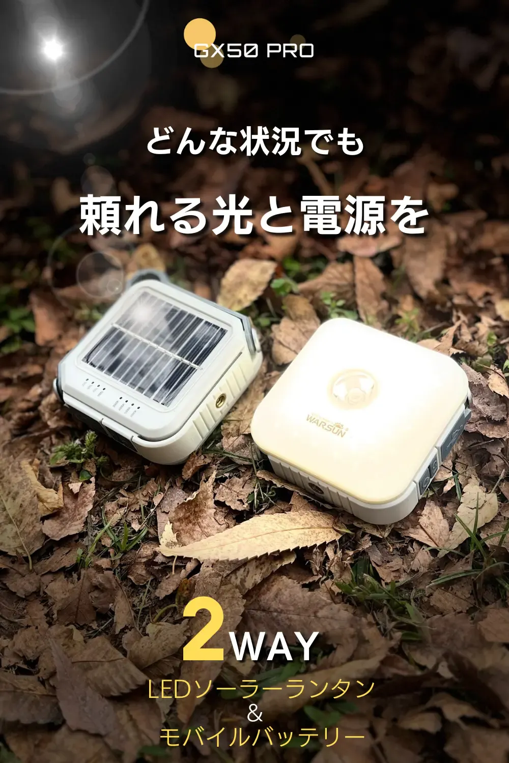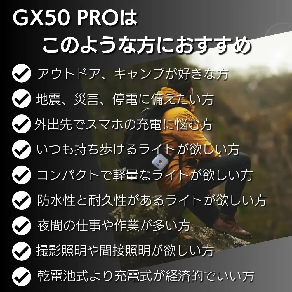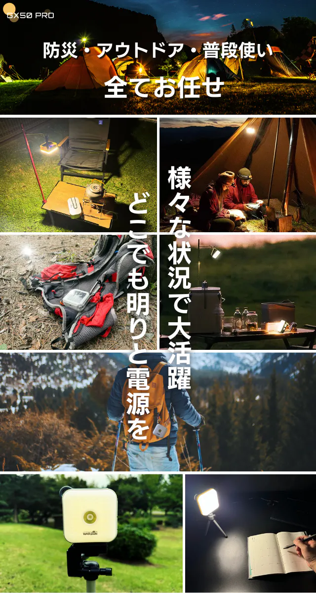 「GX50 PRO」は地震、災害、停電、アウトドア、撮影、日常使いなど様々な状況で活躍する頼れる2WAYランタンです。