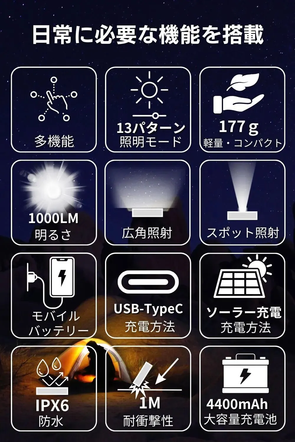 ・明るさ:150Lm~1000Lm・防水:IPX6
