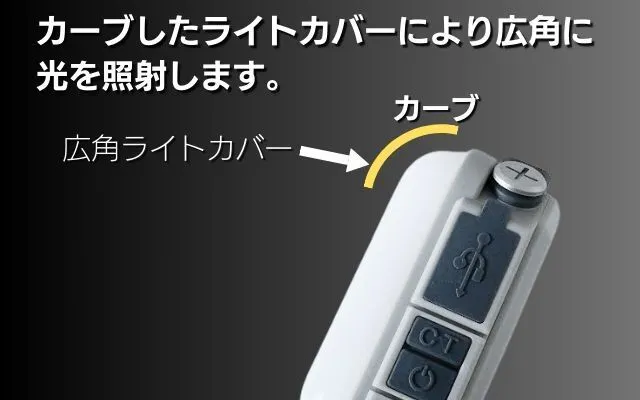 広角ライトカバーにより近くから遠くまで広範囲を明るく照らします。
