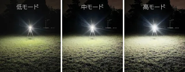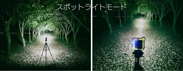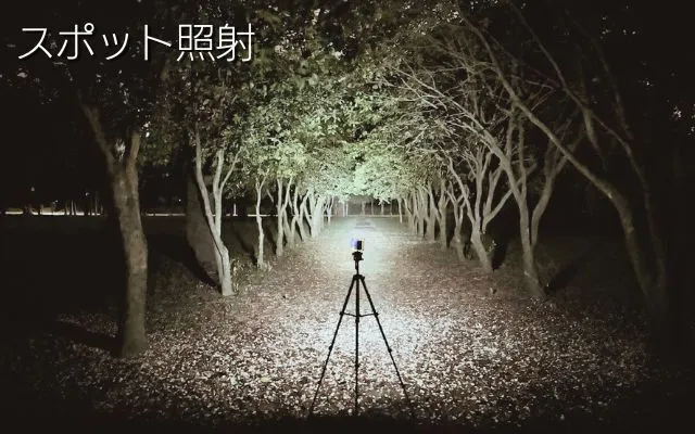 ランタンモードは広角に足下から広範囲を照らし、スポットライトモードは遠くまで明るく照らします。