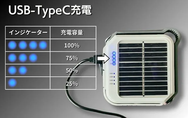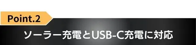 ソーラー充電とUSB-TypeC充電の2WAY充電可能