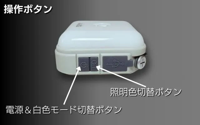 1、白色モード切替操作:(電源&白色モードボタン)を1クリック毎に白色照明モード(低モード⇒中モード⇒高モード)へ切替え