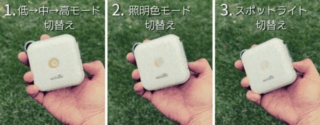 1、白色モード切替操作:(電源&白色モードボタン)を1クリック毎に白色照明モード(低モード⇒中モード⇒高モード)へ切替え