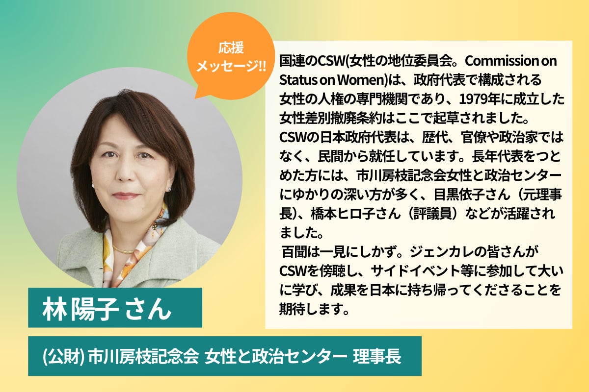 ジェンダー平等実現を目指し活動を続けてきた先達と共に、国際行政とNGOが交差し議論する最も重要な時間に立ち会えた経験は今も私の原点にあります。だからこそ、次は「若者を応援する側」から、次世代の若者たちにも、同じように世界を広げ、行動する力を得てほしいと願っています。ジェンカレを通じた机上での学びを、社会での課題解決の実践につなげてきたジェンカレゼミ生は、CSWの熱気を体感しながら、多くを学びつつ、日本のジェンダー平等を前に進めるため、国際会議の場に日本の若者の声を必ず届けることができます。応援をよろしくお願い申し上げます。