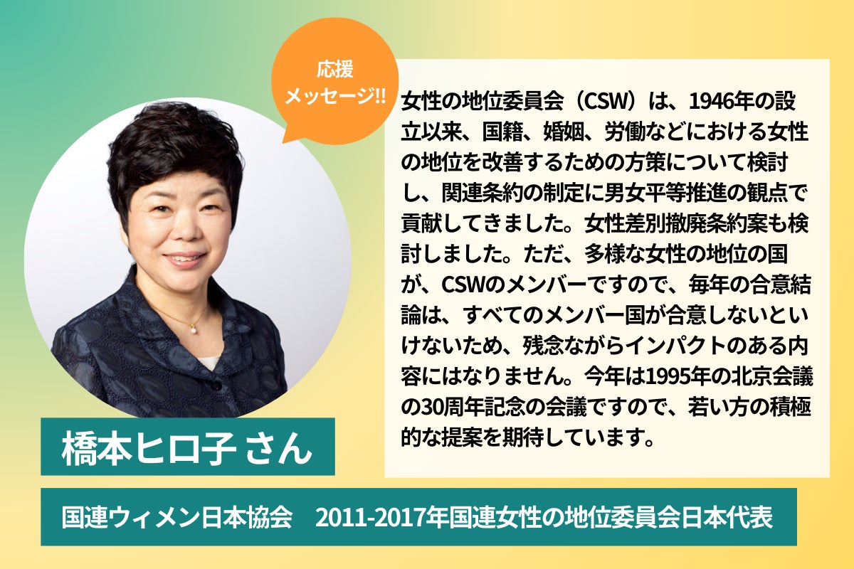 ・CSW日本代表および国連代表部の交渉官やNGOとの対話の機会を活用して声を届けます。