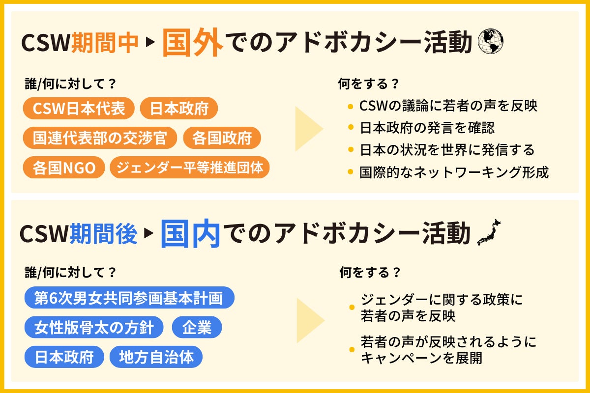 私たちは、ここで日本の若者の声や日本におけるジェンダー課題を世界に発信し、国内外の政策に少しでも反映させるべくアドボカシー活動を行います。