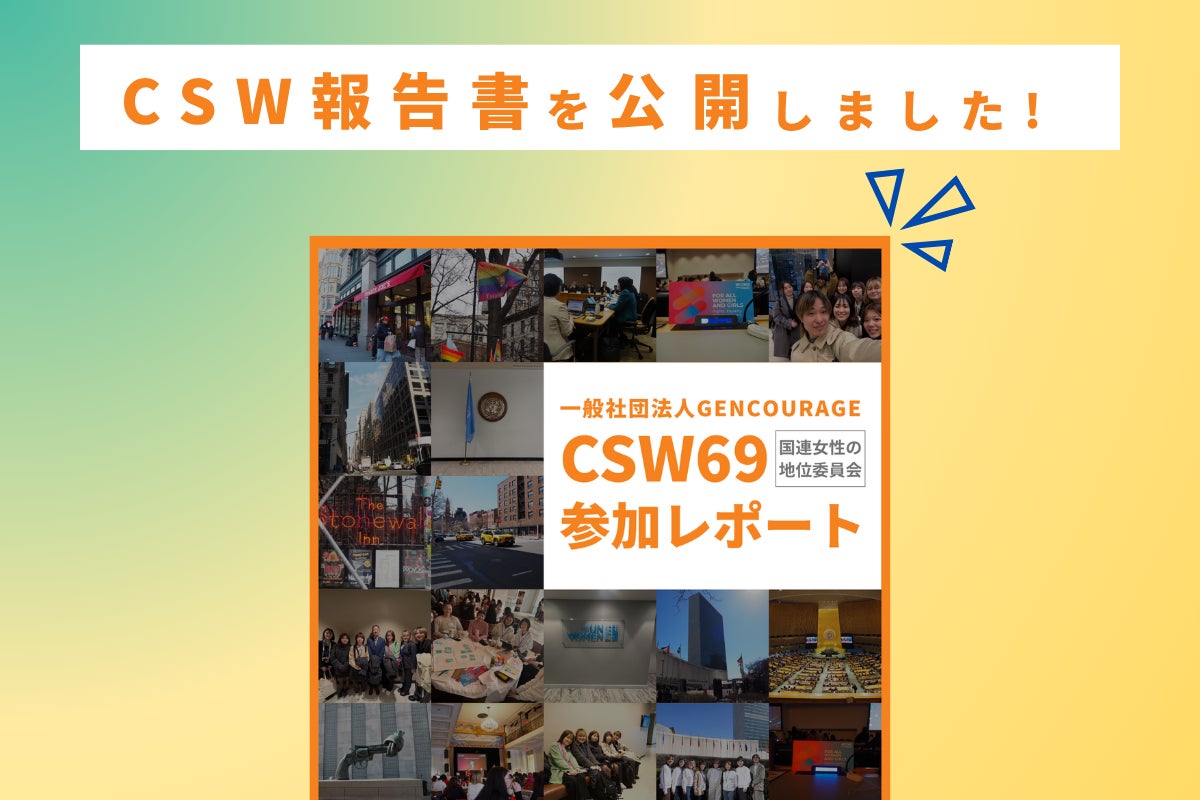 CSWにジェンカレから参加したゼミ生や、他団体から参加した若者と共に、5月頃にCSW報告会を実施します。報告会では、CSWで得た経験や議論の内容、今後の活動計画などをお伝えし、日本のジェンダー平等実現に向けて皆さんの想いを集める場にしたいと思います。※日程は決まり次第ご連絡いたします。