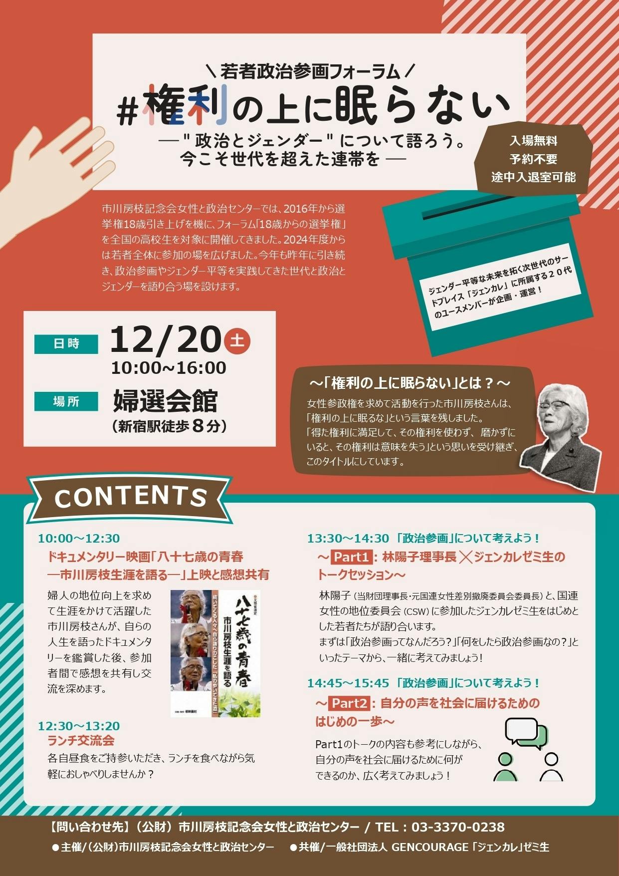 12月20日、(公財)市川房枝記念会女性と政治センター主催のイベントにCSW69参加メンバーが登壇します!
