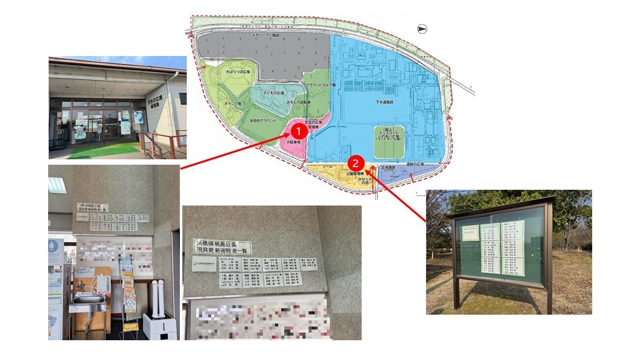 公園内の掲載場所は下記のとおりです。矢橋帰帆島公園に来られた際には、ぜひお名前をご確認いただけると幸いです。