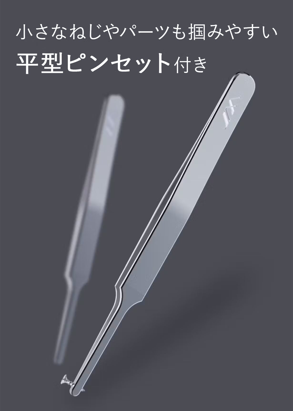 指では作業しにくい細かな精密機器や小さなネジの扱いも、平型ピンセットを使うことで効率的に行えます。JIMISET 30Eのセットには、ピンセットも付属しており、狭い場所での作業や、繊細な部品を取り扱う際にも大変便利です。ピンセットを使うことで、手が届きにくい箇所でも確実に作業を進められるため、時間を大幅に節約できます。