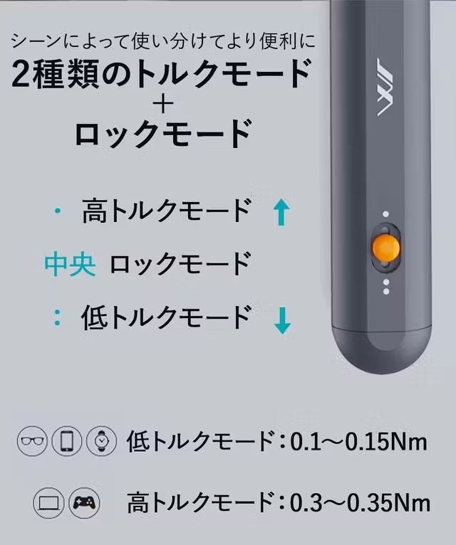 トルクモードは、高トルクと低トルクの2種類があり、作業内容に合わせて簡単に切り替え可能です。低トルクモードは、メガネや時計、スマートフォンなどの精密機器のメンテナンスに最適で、逆に高トルクモードはノートPCやゲーム機、電気製品のDIY作業に最適です。また、ロックモードを使用することで、細かい調整が必要な手動作業にも対応可能です。