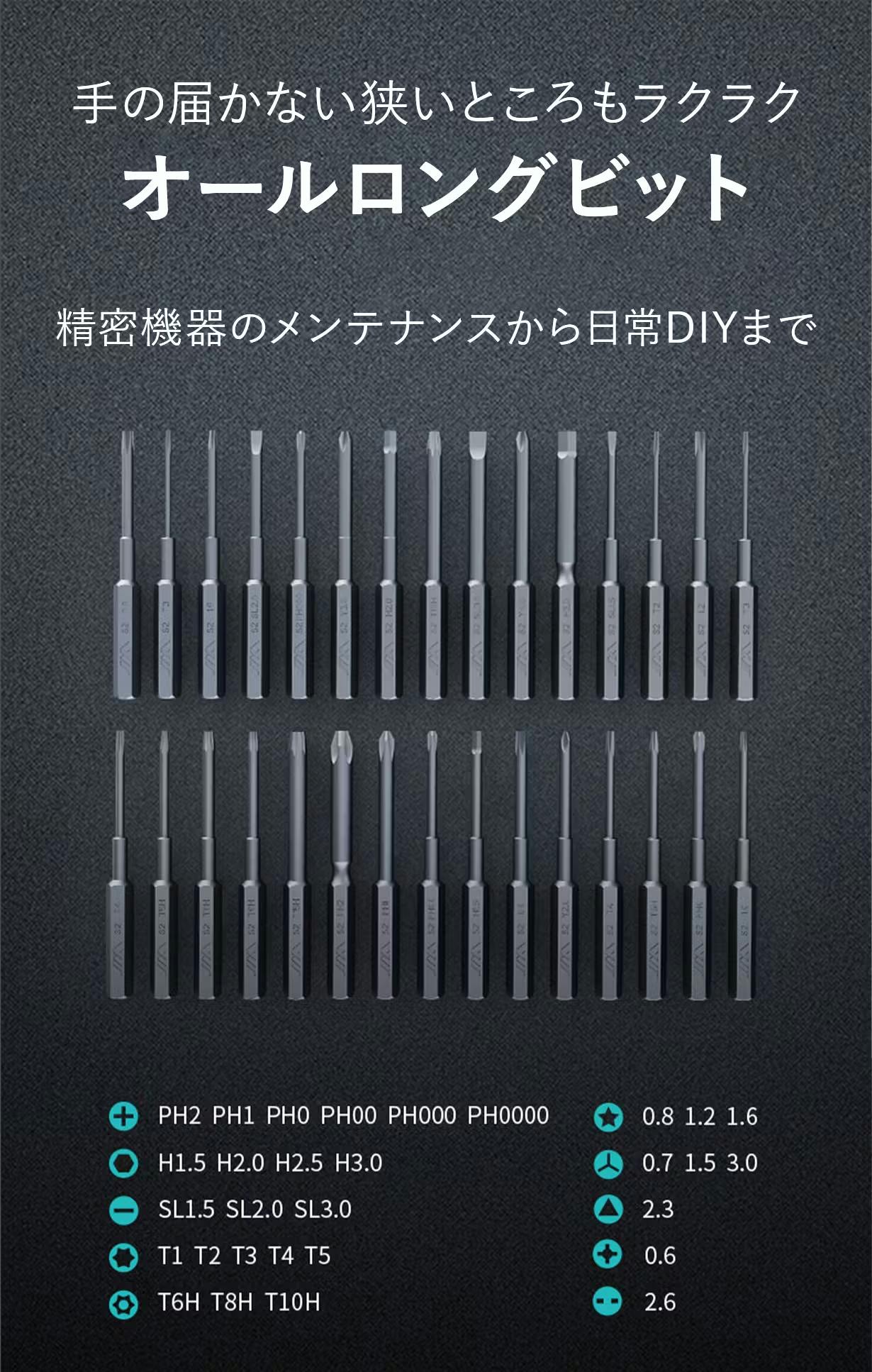 狭い場所や手が届かない場所での作業って、短いビットではどうしても難しいですよね。そんな時に役立つのがJIMISET 30E。オールロングビットを使えば、これまで届かなかった場所でも簡単にアクセスできます。これで、作業のストレスが大幅に軽減!ビットが長いことで、手が届きにくい箇所でも作業がしやすくなるんです。