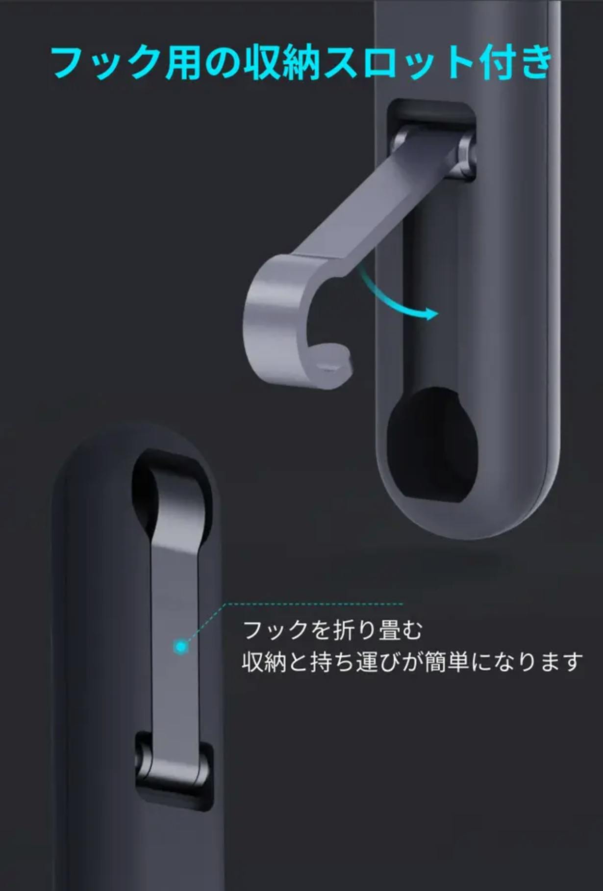 フックを使用しないときは裏面のスロットに折りたたんで収納できるので邪魔になりません。