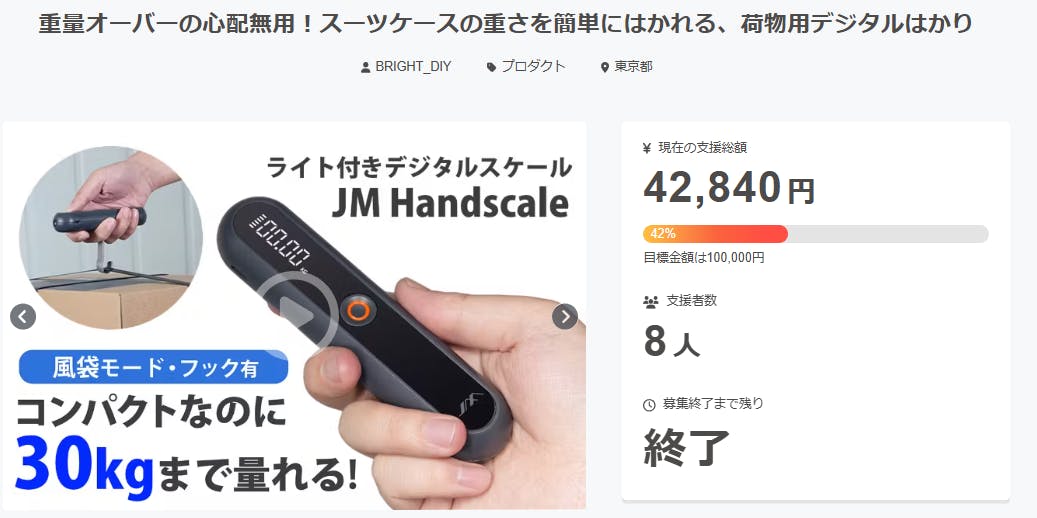 2025/03/01 00:20ご支援者様、重量オーバーの心配無用!スーツケースの重さを簡単にはかれる、荷物用デジタルはかりにご興味をお持ちいただきありがとうございます。プロジェクト開始から35日目で8人ものご支援者の方々より支援頂き、無事プロジェクト終了を迎えることが出来ました。早速皆様のリターンを2025年03月末にお届けできるよう準備を始めております!皆様にご満足いただけるリターンをお届けできるよう、全力で取り組んで参りますので引き続き、「重量オーバーの心配無用!スーツケースの重さを簡単にはかれる、荷物用デジタルはかり」をよろしくお願い致します。BRIGHTチーム もっと見る