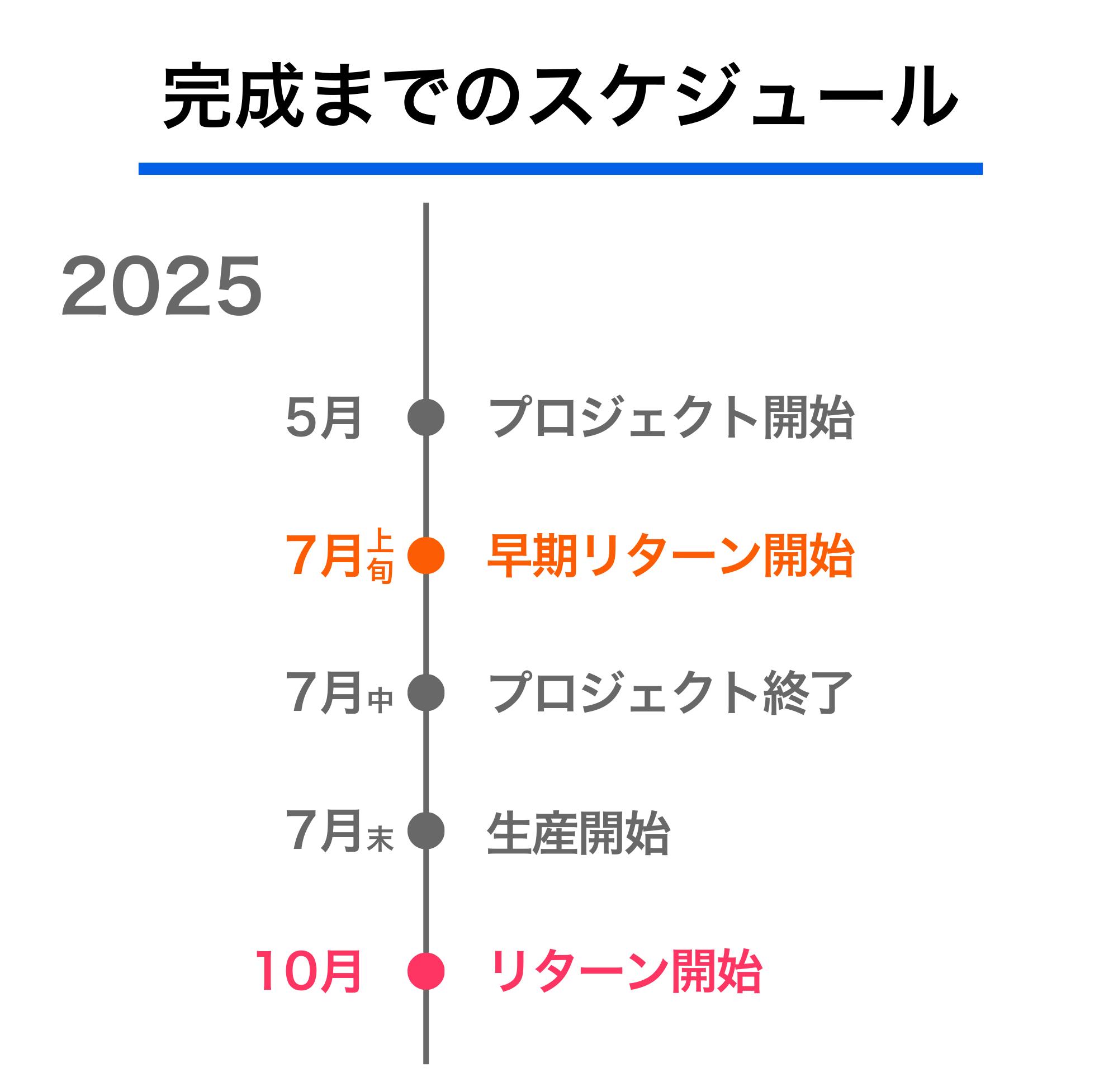 ※本文中に記載させていただいたスケジュールは、あくまでプロジェクト公開時点の予定です。クラウドファンディングの性質上、配送遅延のおそれがございます。