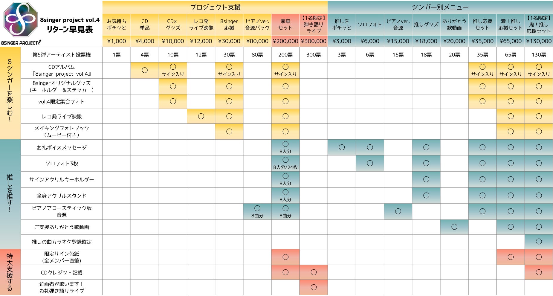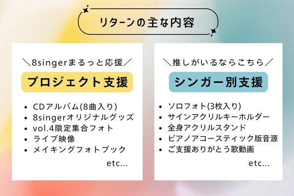 8singerをまるっと応援できる『プロジェクト支援』と、応援したいシンガーを指名できる『シンガー別支援』です。