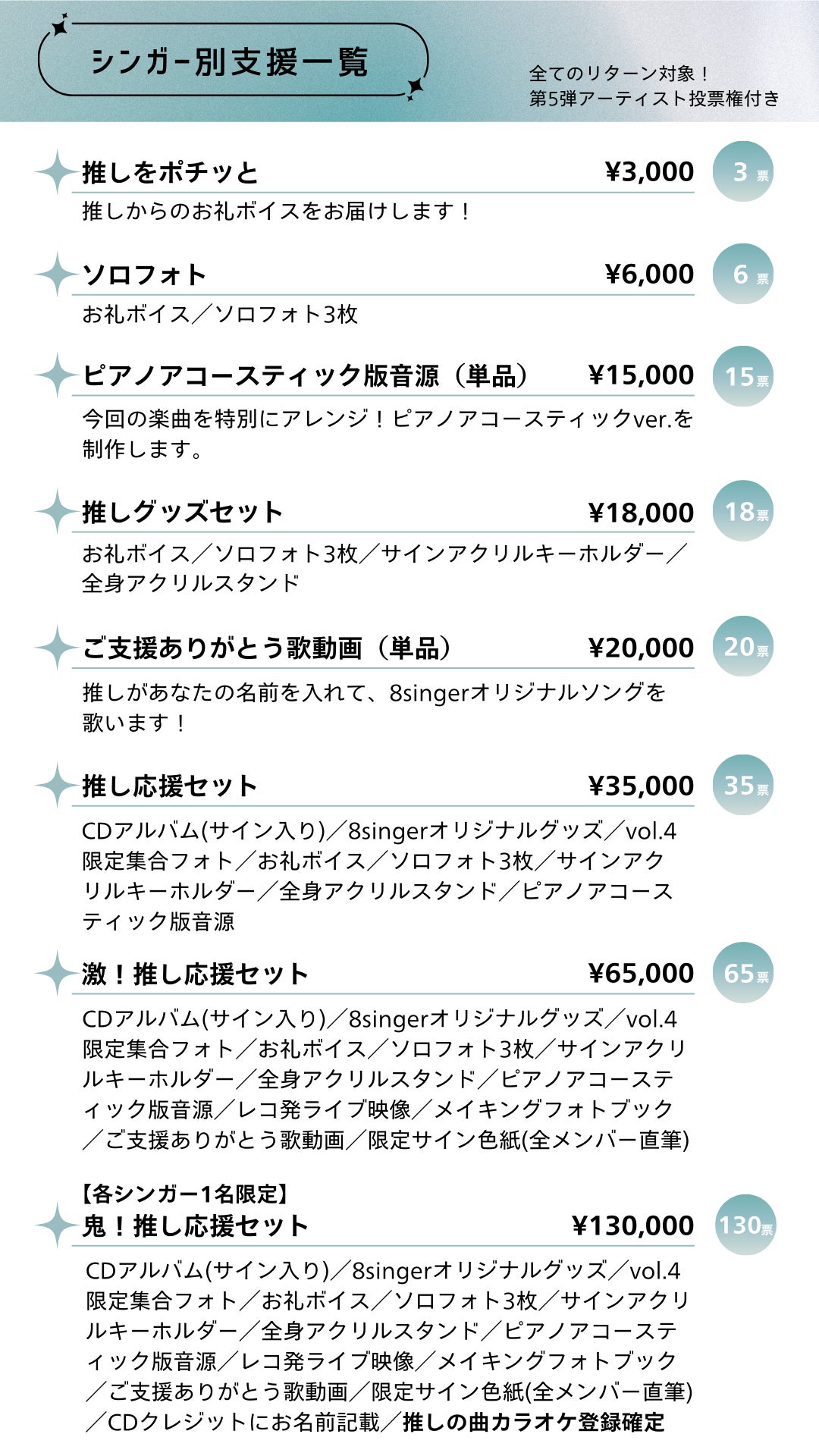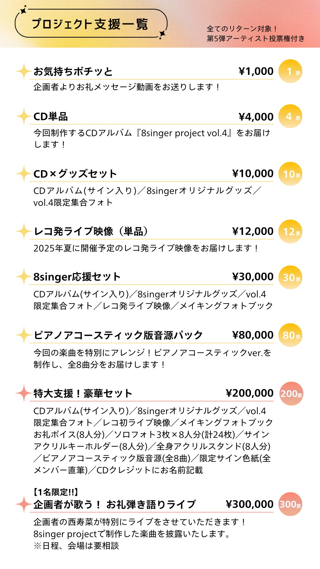 すべてのリターンには「第5弾アーティスト投票権」が含まれており、次回プロジェクトの参加シンガーを皆さまの投票で決定(※)します。