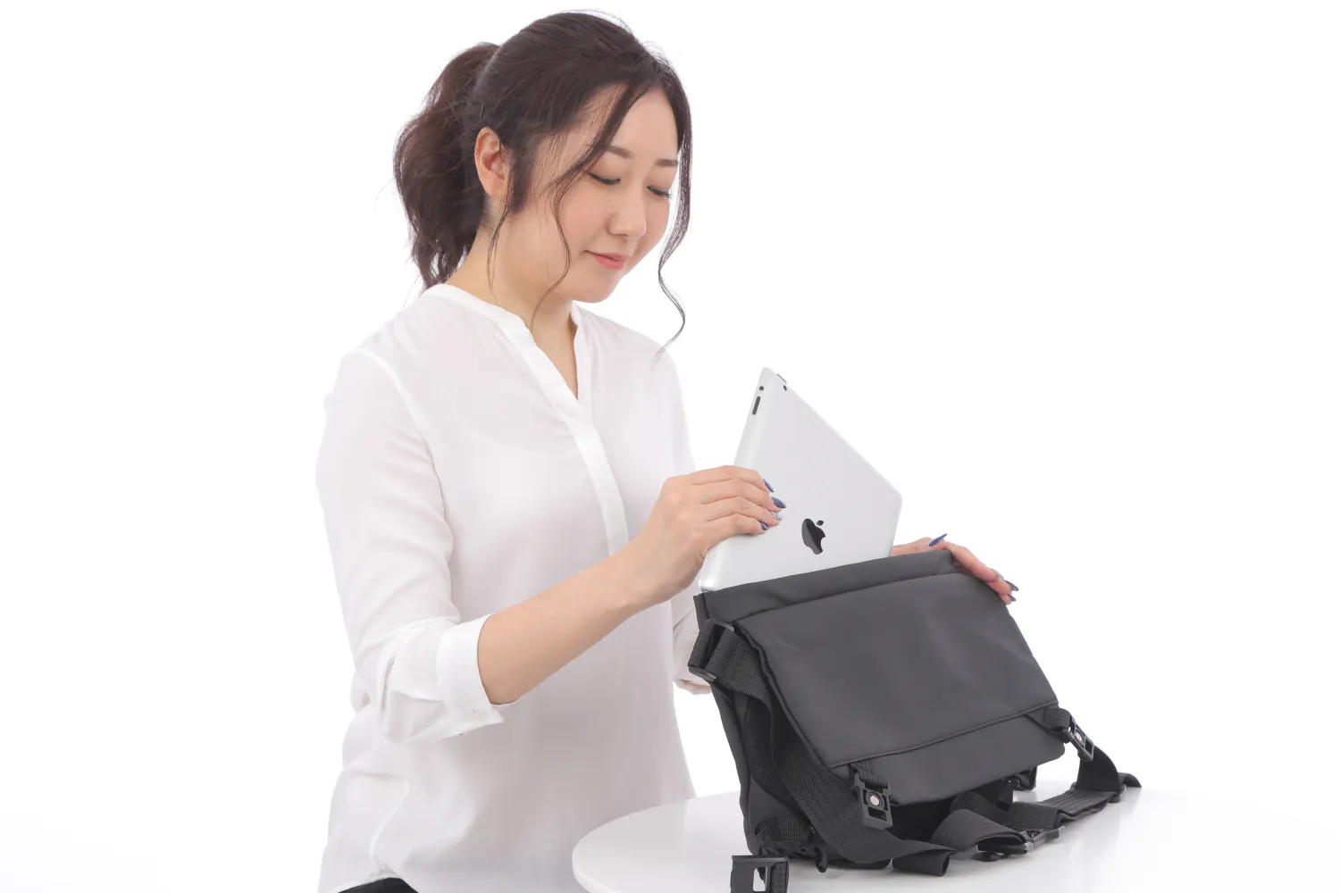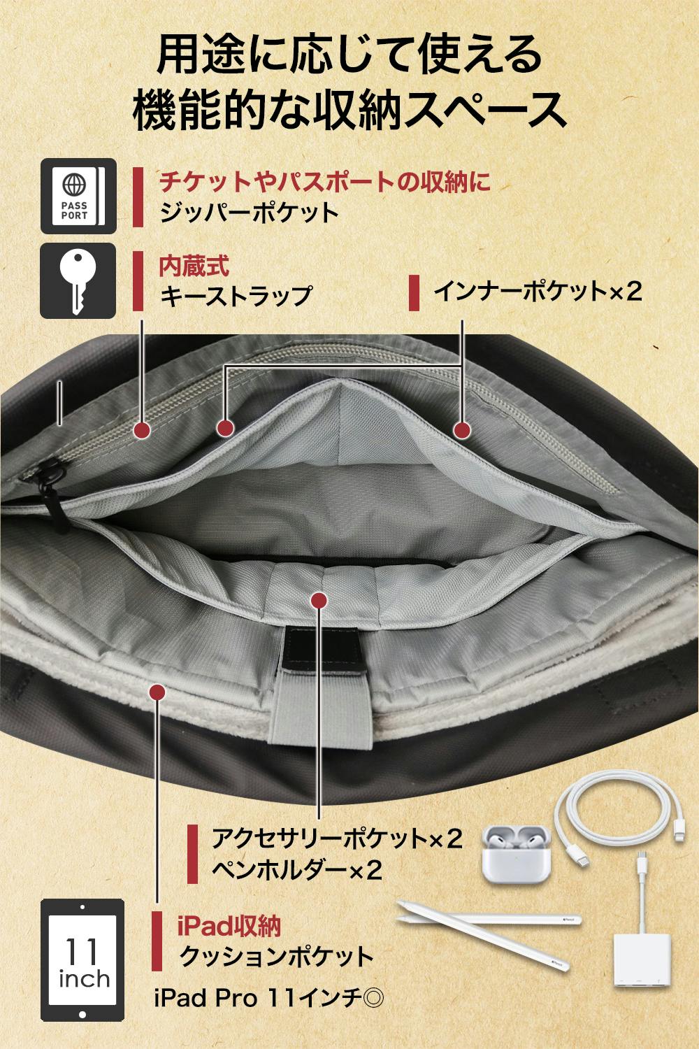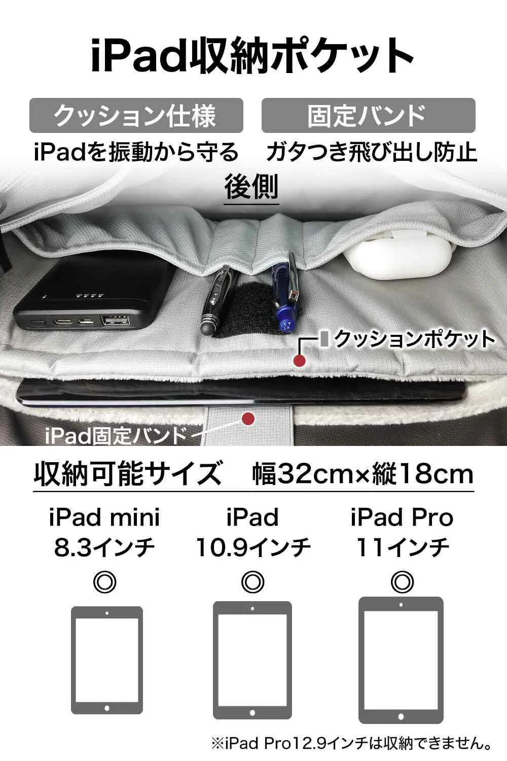 A:iPad Proの11インチサイズまで入りますが、iPadのケースをご利用の場合、ケースサイズにてご確認をお願いいたします。 ※iPad Pro 12.9インチは入りません。