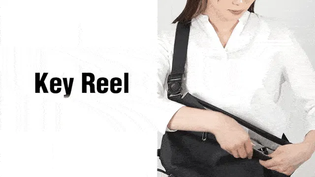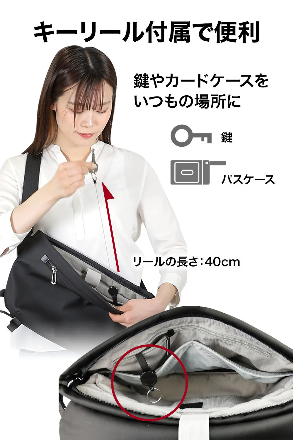 フラップを開けずにサイドからスマートフォンや財布・鍵・パスケース等を素早く取り出すことができるようになりました。ポケット内部にキーリールをかけられるフックがあり、鍵を引き出して使えます。