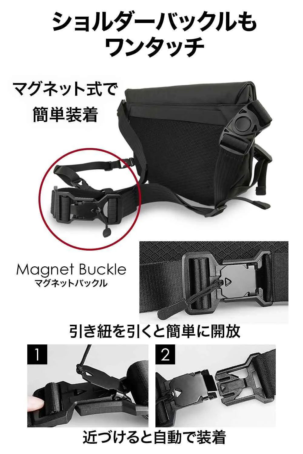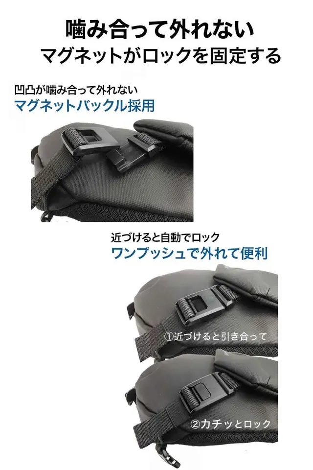 A:マグネットバックルは、簡単に外れないように磁力によりロックされる仕組みです。荷物をたくさん入れても、またショルダーストラップを引いても、勝手に外れることはありません。解放するときは、引き紐を引くと簡単にロックが外れます。