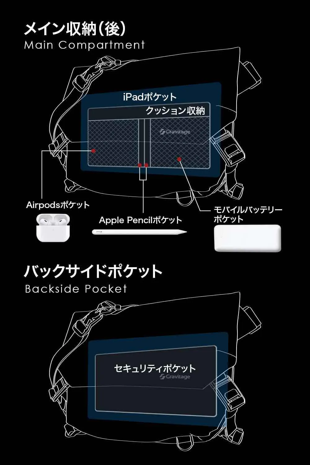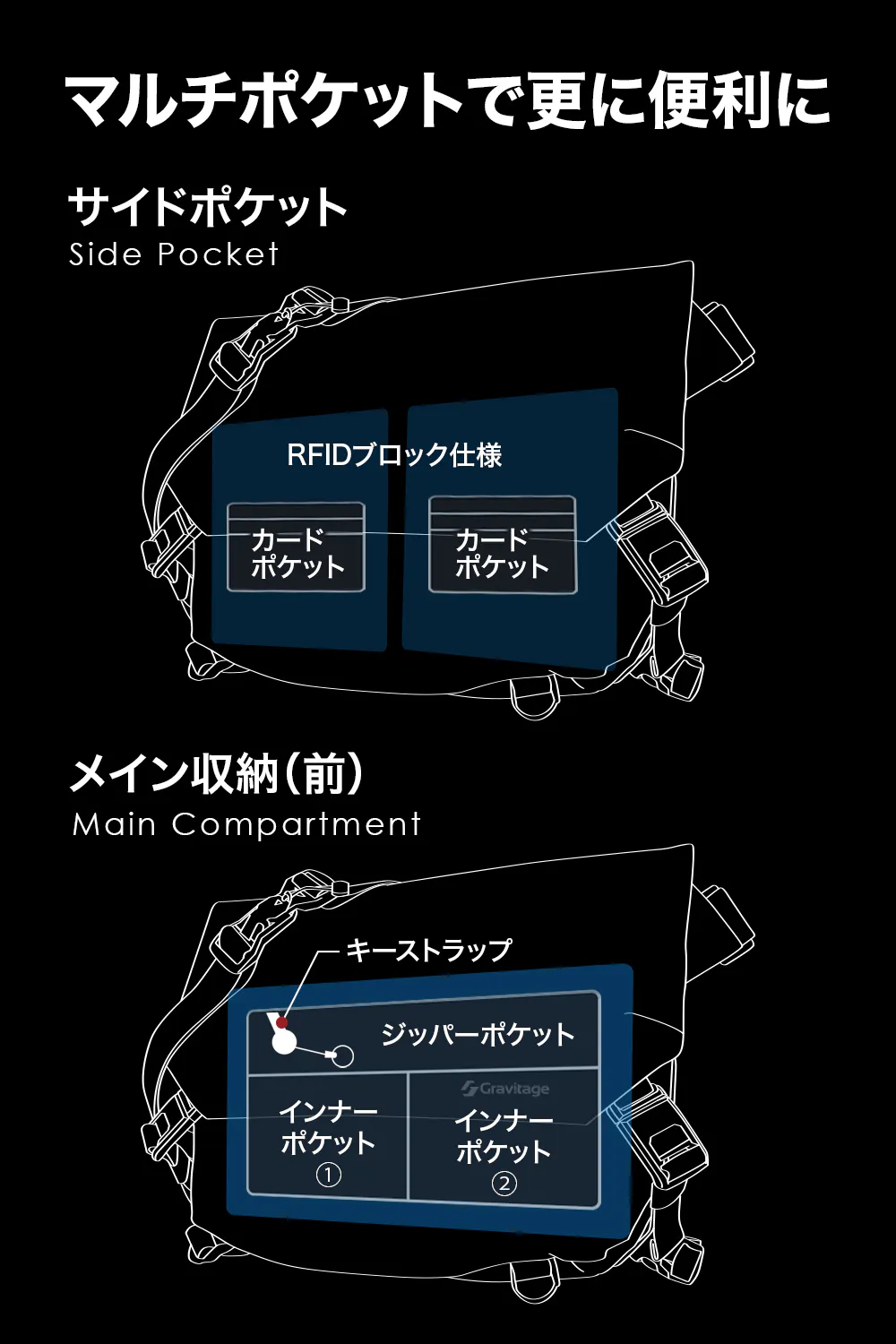 A:このバックには両側にサイドポケットがございます。サイドポケットの表側はRFIDブロックされており、内部にカードポケット(3枚)がございます。左右2つにそれぞれ、財布、スマートフォンなど薄手の小物が入ります。