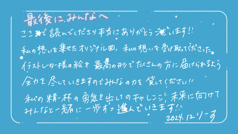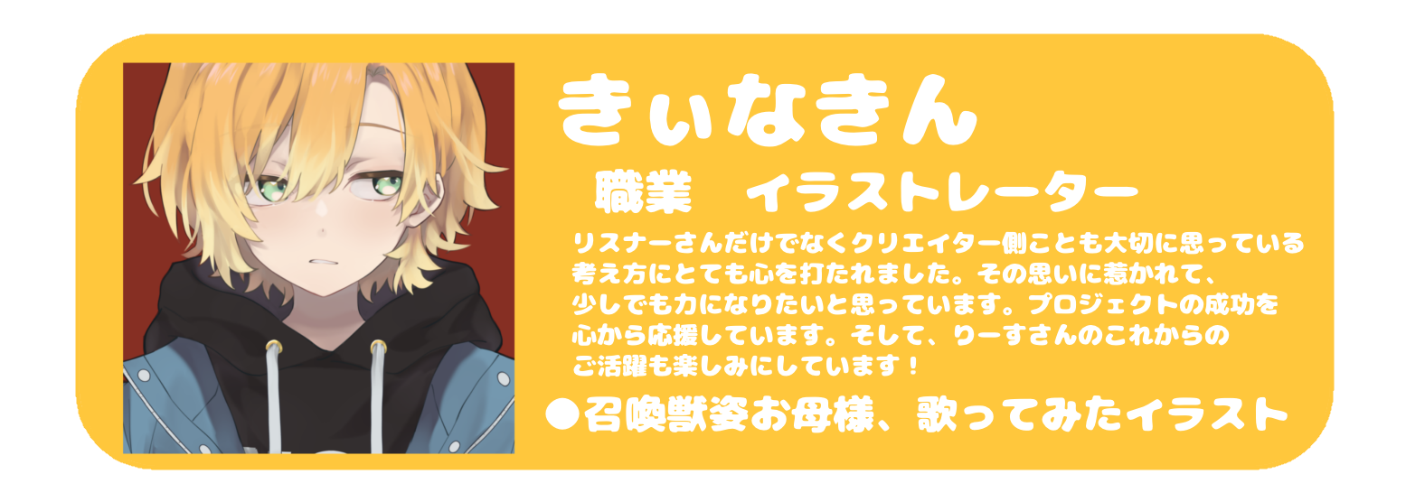 りーすさんの初のオリジナル楽曲を皆さんと一緒に作り上げることを心から楽しみにしています!よろしくお願いします!