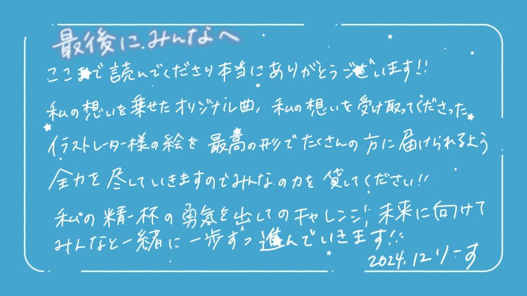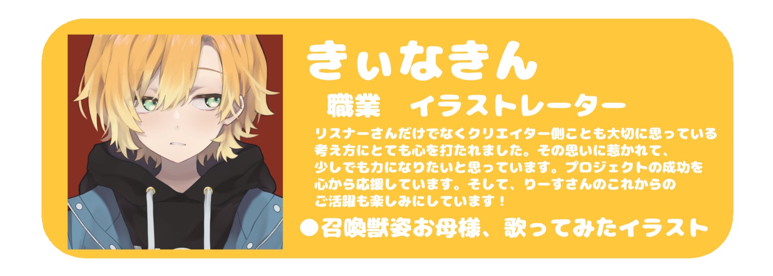 りーすさんの初のオリジナル楽曲を皆さんと一緒に作り上げることを心から楽しみにしています!よろしくお願いします!