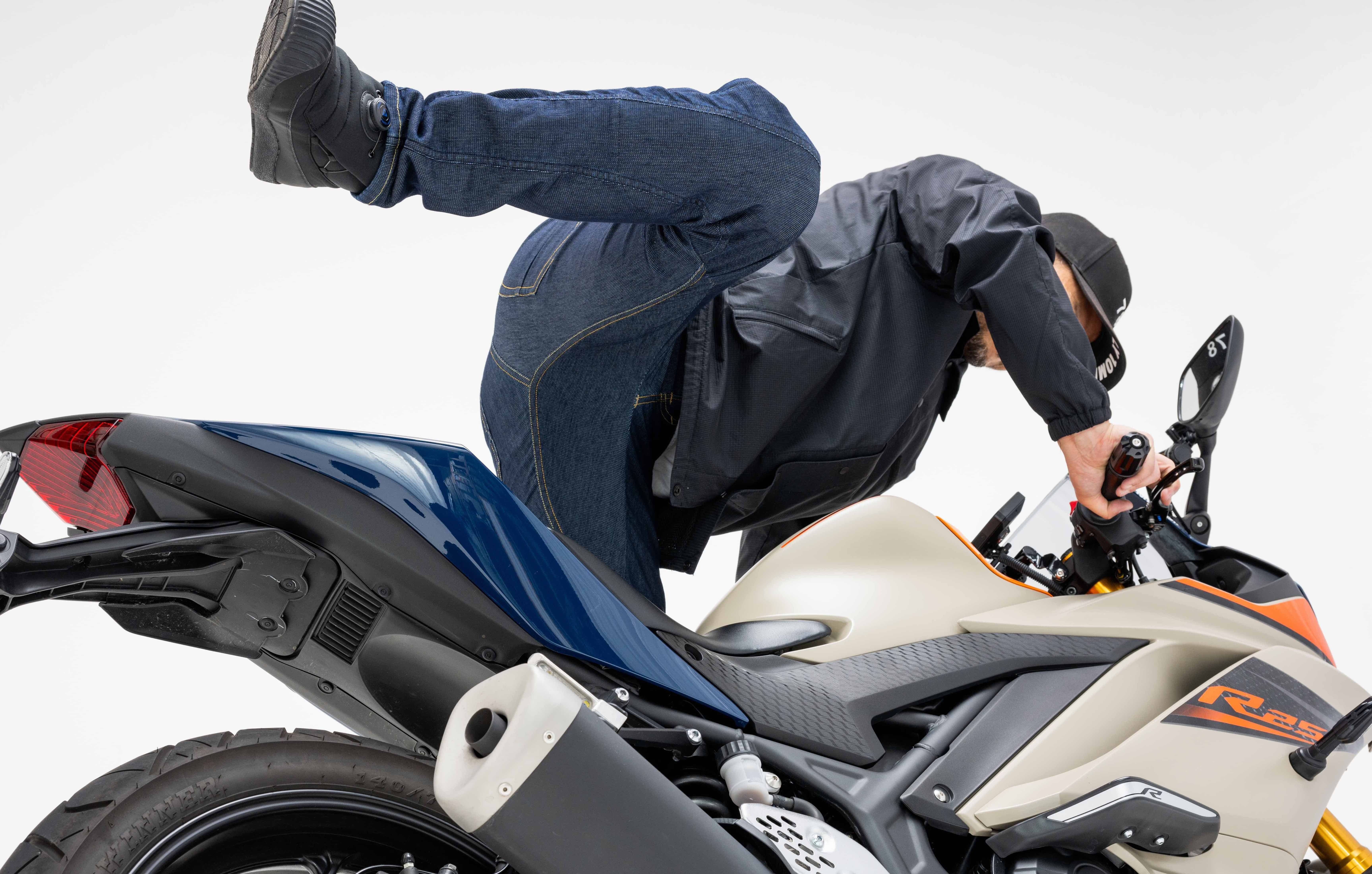 そして、股下が82cmになった事で、乗車時の見た目も安心になりましたが・・・停車発進時の脚の上げ下げで裾が上がってくる現象を緩和する事ができています!これ地味な改善ですが【空冷式ジーンズ】においては非常に重要な改善となっています。