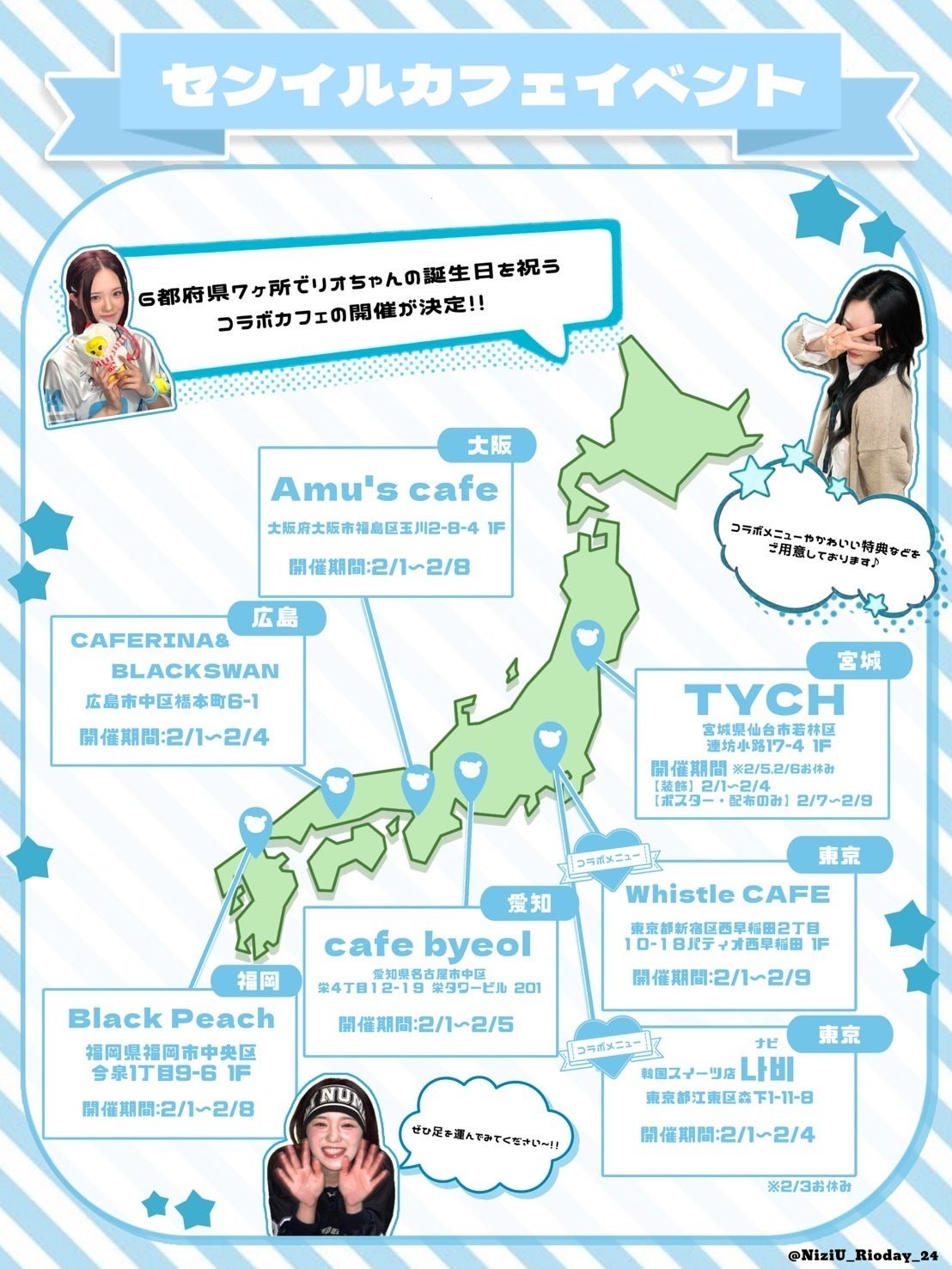 ご不明点ございましたら店舗様へのお問合せはご遠慮いただき、こちらのメッセージかTwitter@Niziu_rioday_24 までによろしくお願いします。